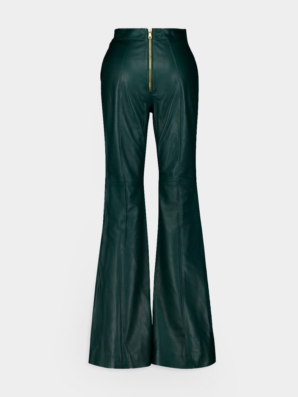 Button-Embellished Leather Flared Trousers, crafted with precision from premium leather, these trousers feature exquisite embossed gold-tone buttons that add a touch of opulence to your look. The two side inset pockets provide both style and functionality, while the exposed rear zip fastening ensures a seamless fit. Embrace the fashion-forward design with a flared hem and extra-long length, adding an elegant flair to your outfit.
