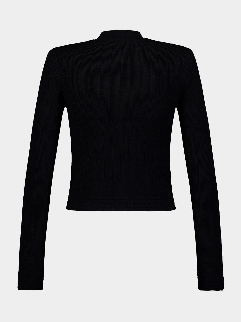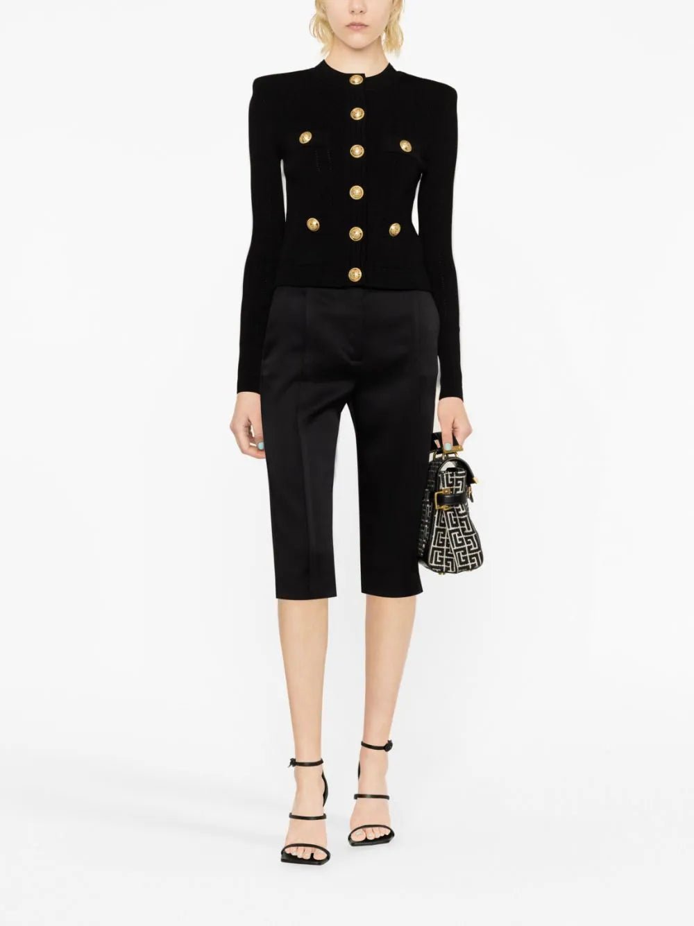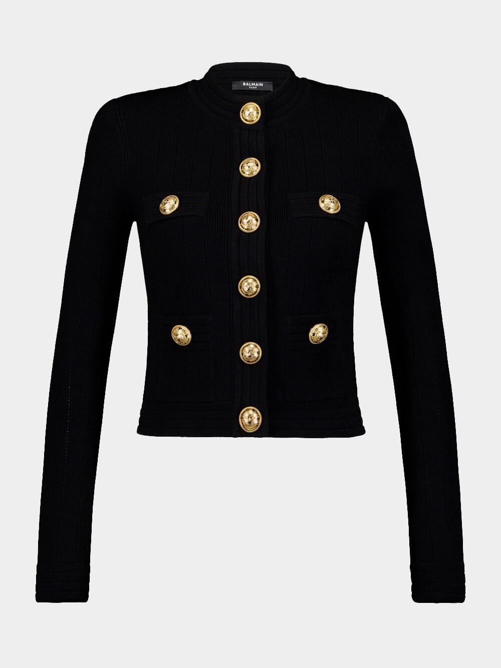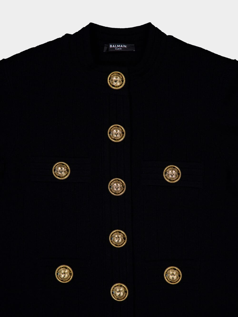 Buttoned Fine-Knit Cardigan, meticulously crafted in a fine knit for unmatched comfort and style. Adorned with exquisite embossed gold-tone buttons, this cardigan features a timeless round neck and long sleeves, ensuring a chic and cozy fit. The straight hem adds a touch of sophistication, while the four front patch pockets provide both functionality and elegance.