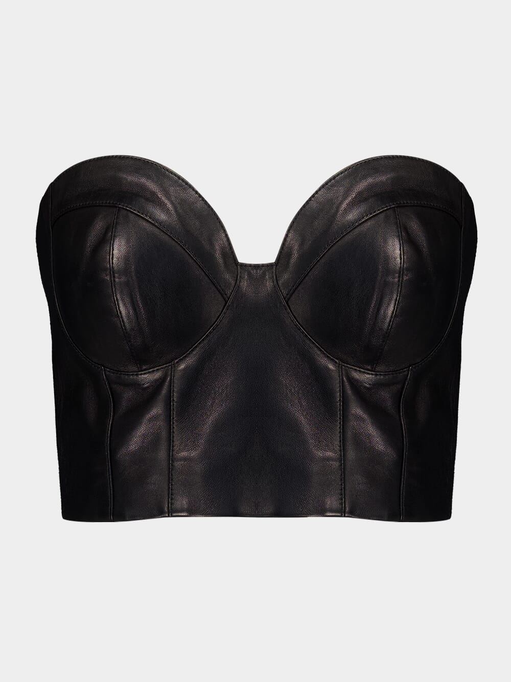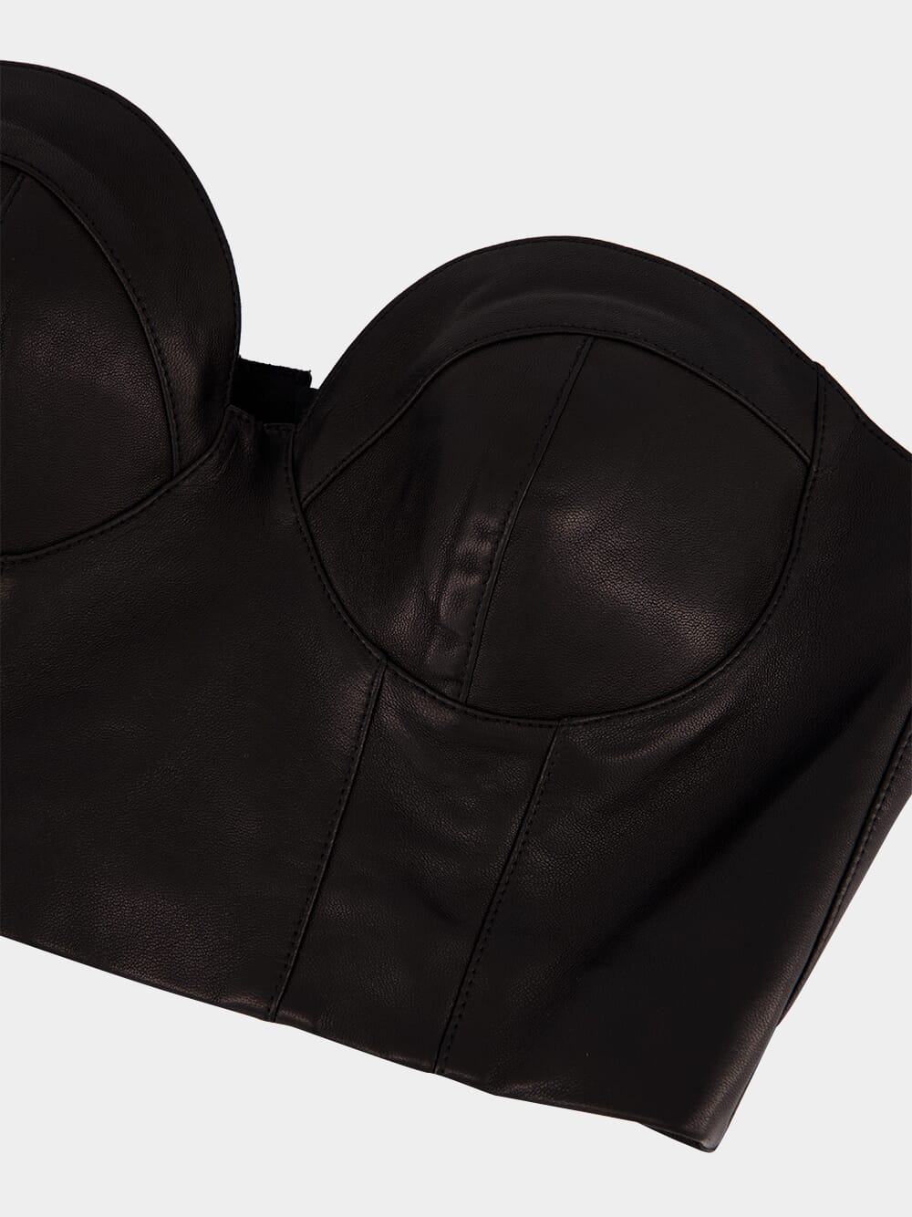 This black leather corset top, crafted from 100% luxurious lambskin, is a bold and edgy statement piece. Featuring a corset style with a structured panelled bodice, this cropped top exudes sophistication and style. The strapless design and straight hem offer a sleek, figure-flattering silhouette, while the rear zip fastening ensures a snug and secure fit. Perfect for making a statement at any occasion, this leather corset adds a daring touch to any outfit.