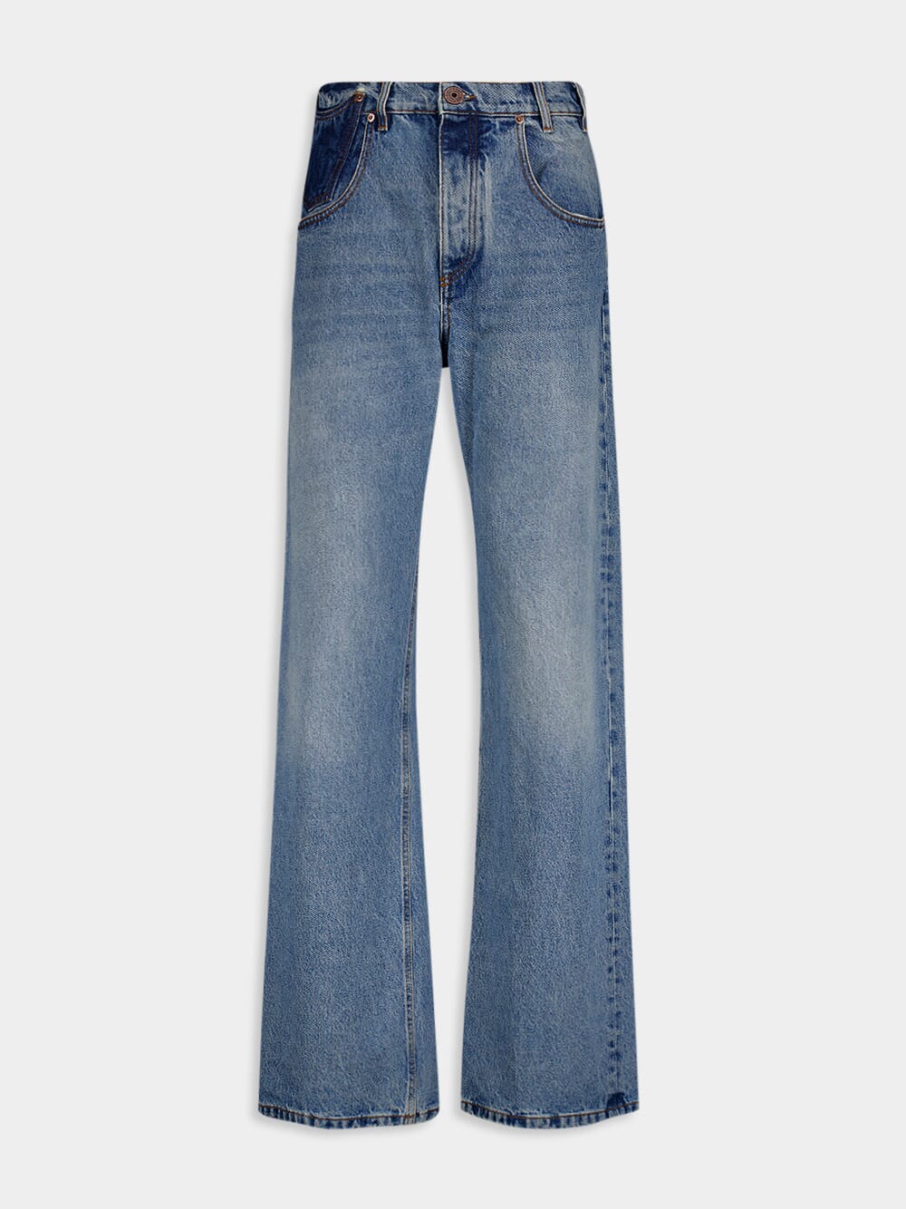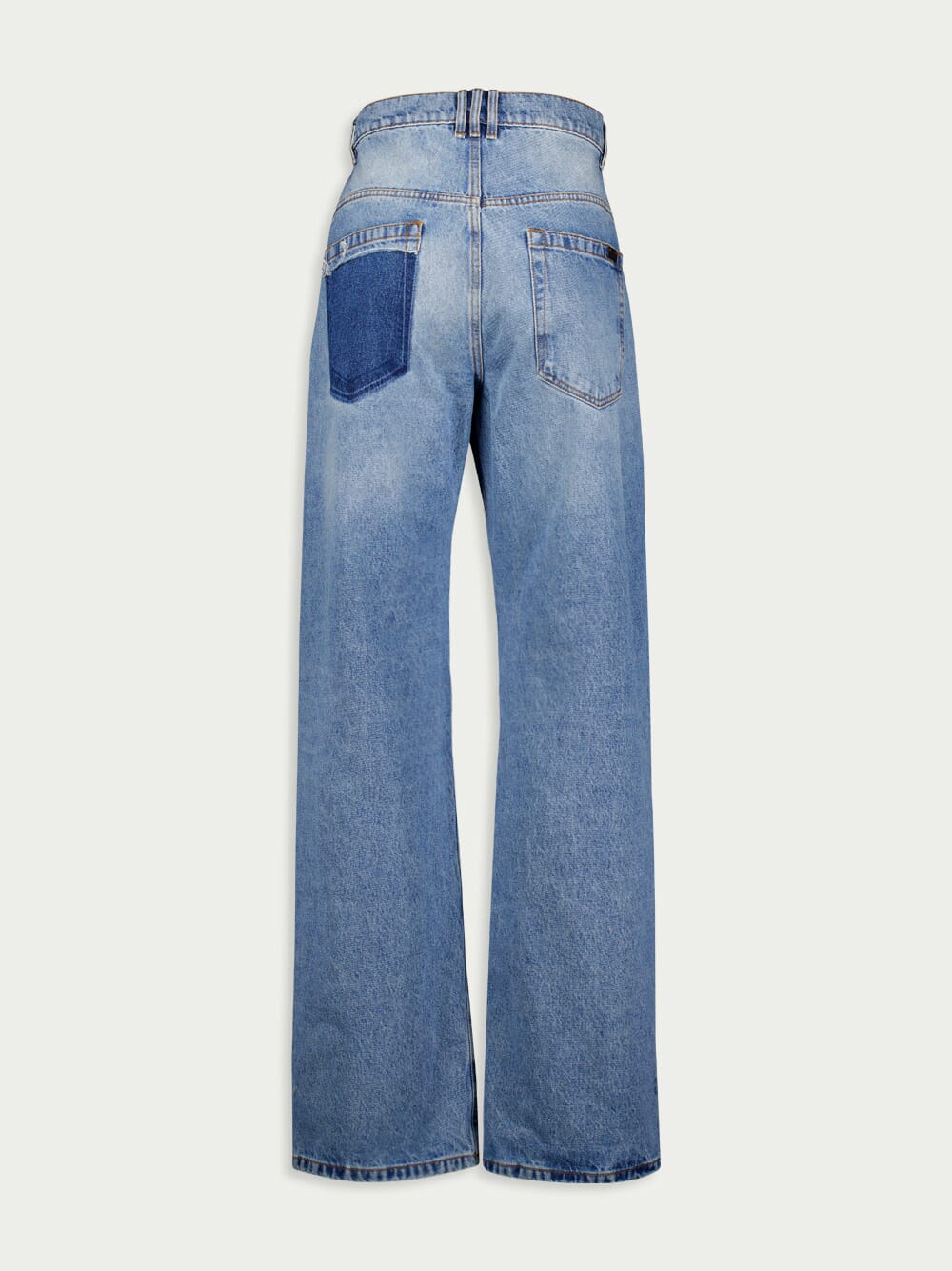 A perfect blend of style and comfort. Designed with a high waist, these jeans offer a flattering fit that's both fashionable and versatile. The front button and zip fastening, along with belt loops, ensure a secure and adjustable fit. The contrasting pocket and rear patch pocket add a chic touch, while the logo plaque adds a hint of sophistication. With a wide leg and long length, these jeans seamlessly combine fashion and functionality.