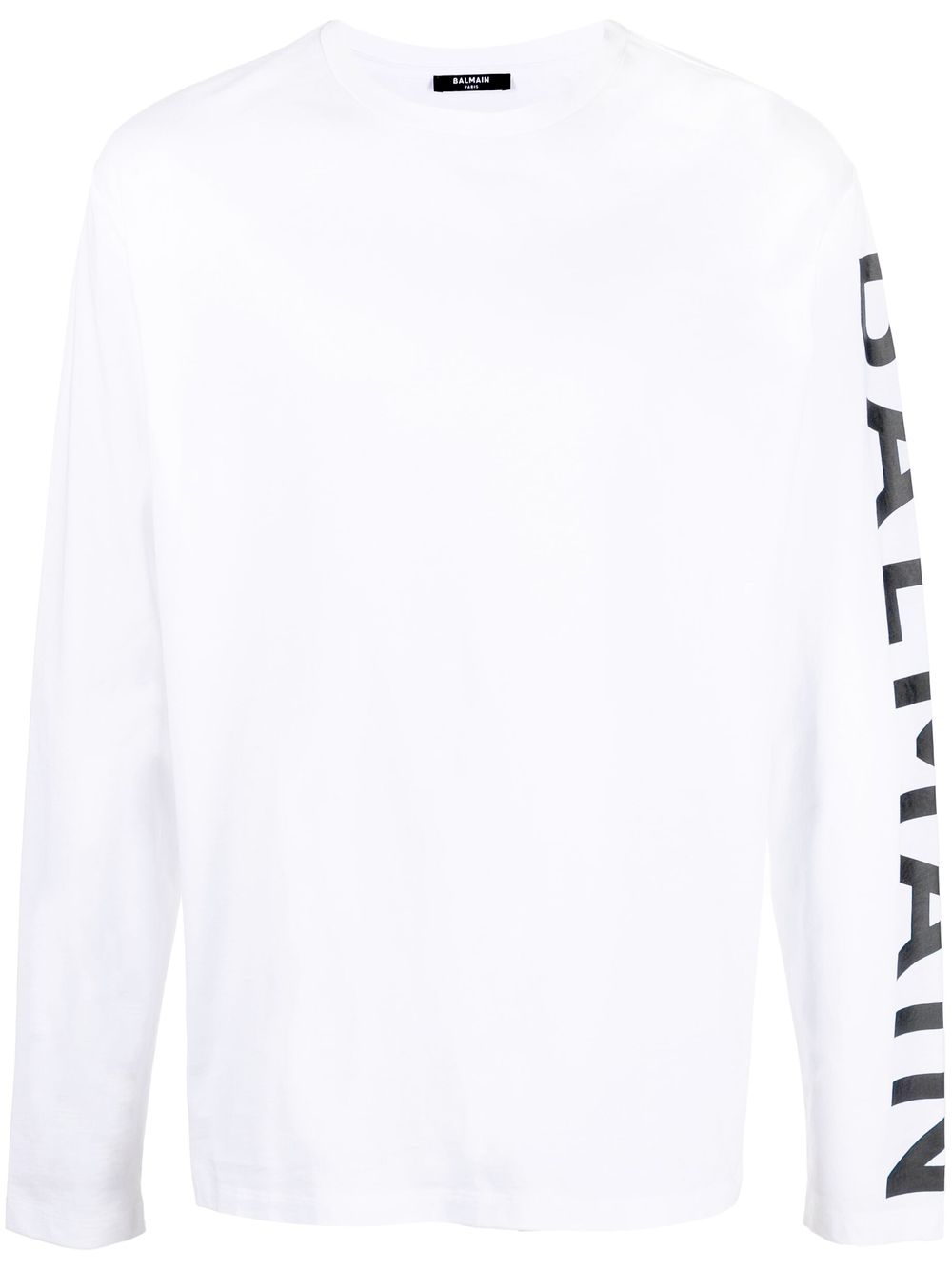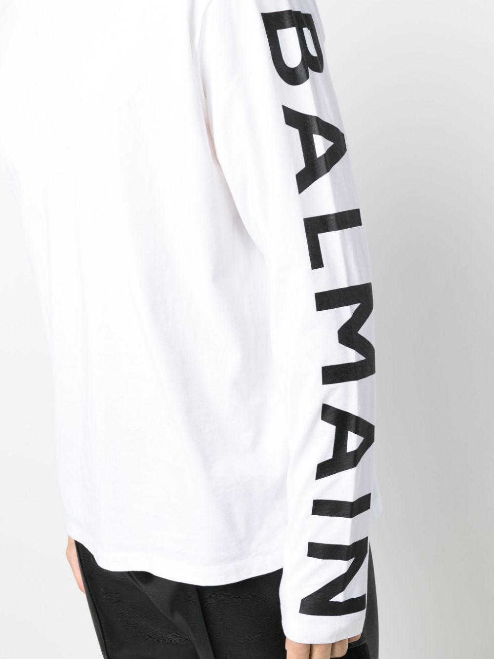 Balmain white cotton long-sleeved t-shirt with white logo print on left sleeve.