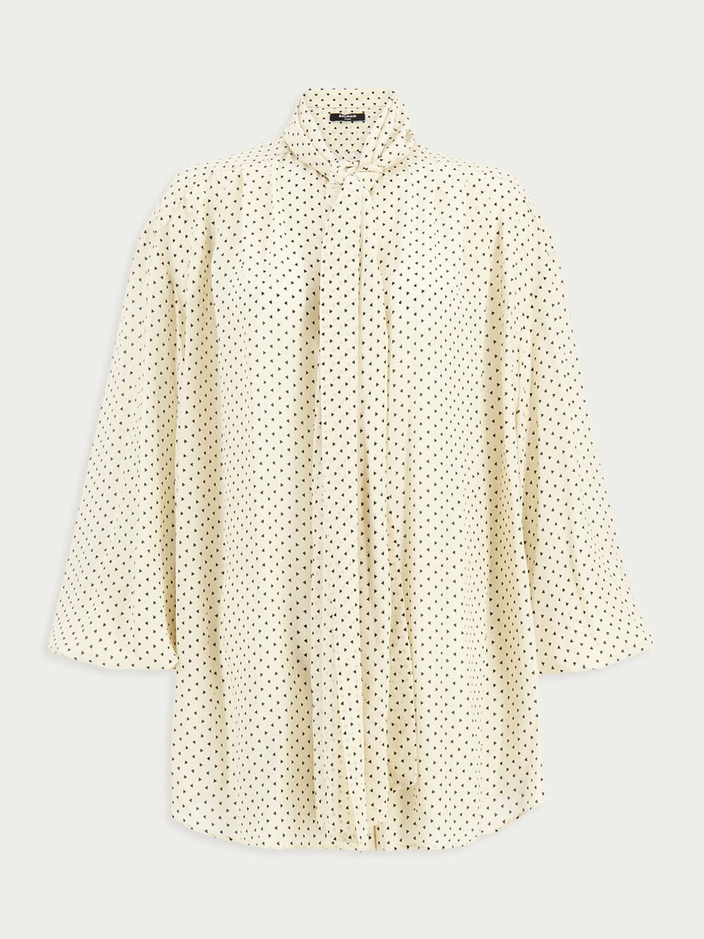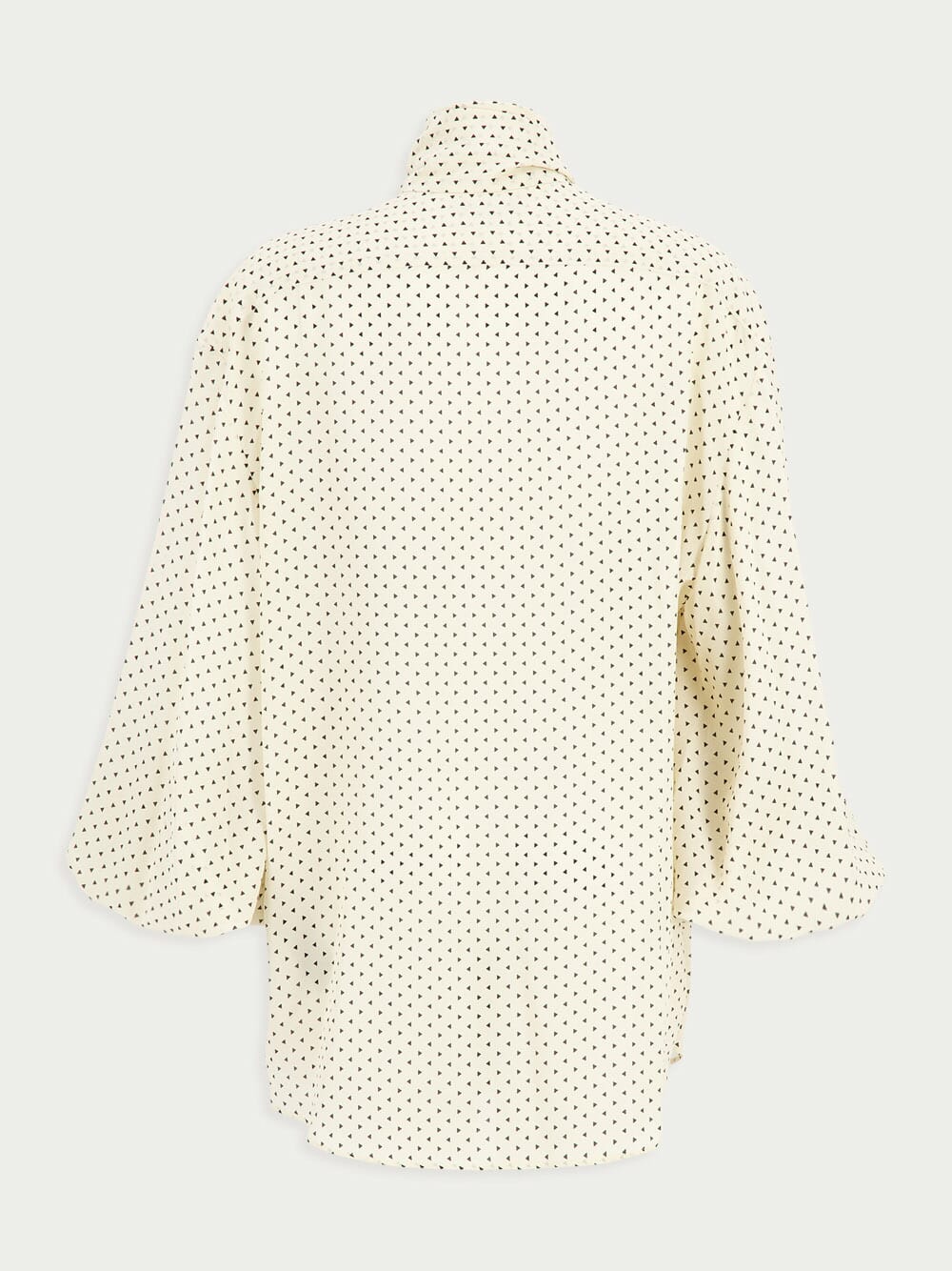 Printed Pussy Bow Silk Blouse, adorned with a captivating geometric print. The iconic pussy-bow collar adds a touch of timeless charm, while the front button fastening ensures a seamless fit. Embrace sophistication with the allure of long sleeves and a sleek straight hem.