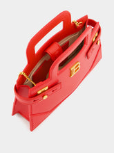 The B Buzz Small Top Handle Bag by Balmain is crafted from 100% calfskin leather in a bold red hue. Featuring a structured silhouette, it includes gold-tone hardware, a prominent "B" logo, and adjustable chain strap for versatile styling. Perfect for elevating both day and evening looks. Made in Italy for premium quality.