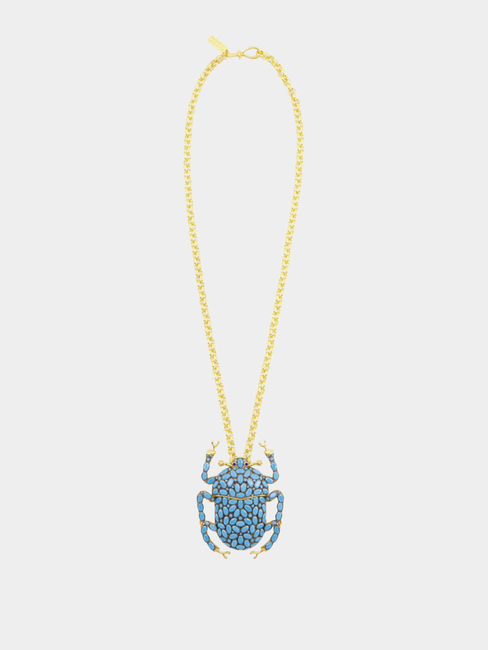 Begum Khan Bitter Sweet Love necklace featuring a beetle pendant embellished in lustrous gemstones, adding a touch of glamour and sophistication to any outfit. Each Begum Khan Bitter Sweet Love necklace is handcrafted in Istanbul by skilled artisans, ensuring that every piece is unique and of the highest quality. The adjustable chain makes it easy to wear, and the gold and turquoise design adds a pop of color and elegance to any outfit.