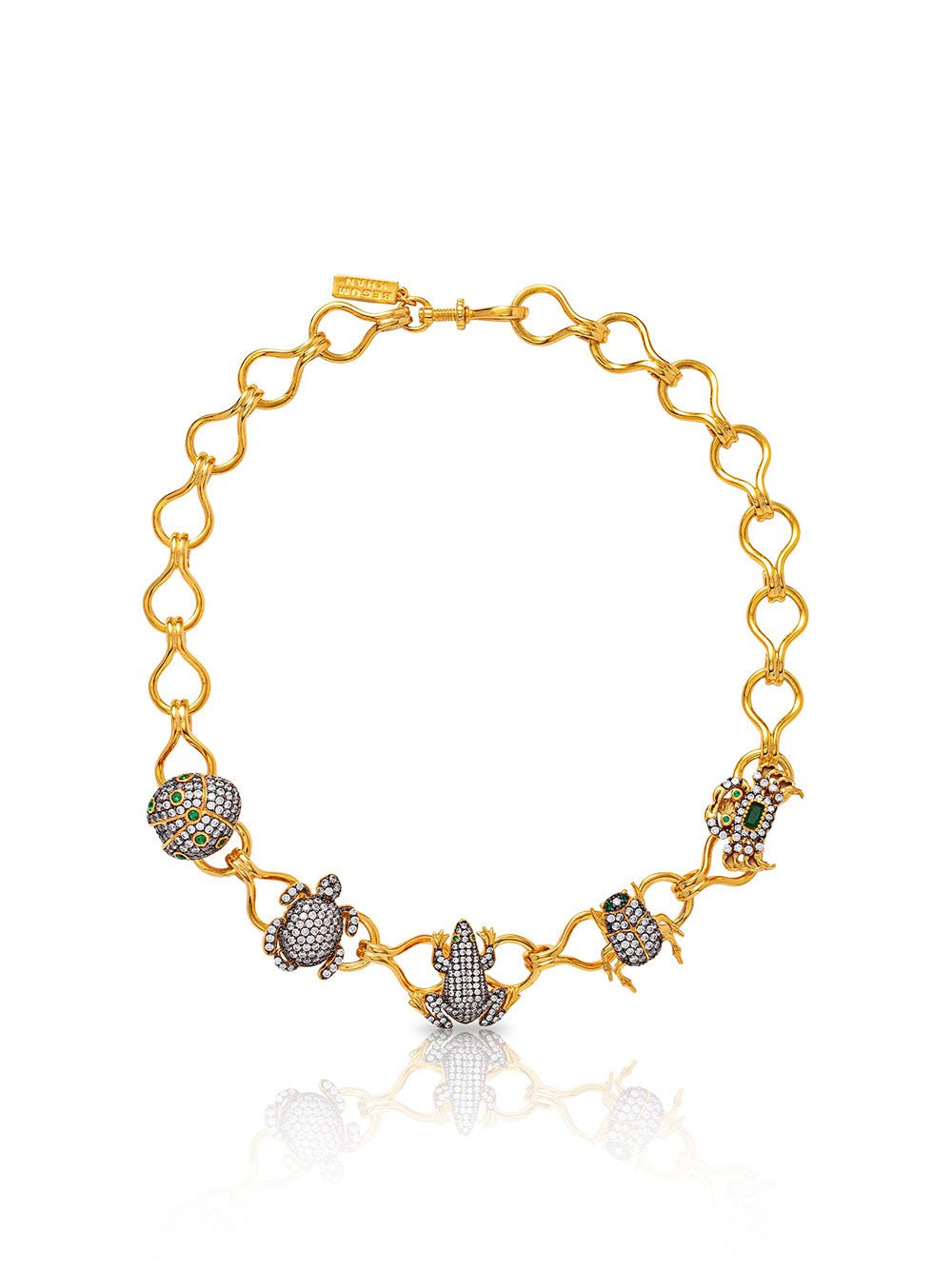 Begum Khan Icons Artemis choker handcrafted from high-quality gold and adorned with sparkling crystals, this choker is a true work of art that exudes luxury and sophistication. The design of this choker is inspired by the goddess Artemis, known for her strength, independence, and beauty. The adjustable chain of this necklace ensures a perfect fit for any neck size, making it a versatile accessory that can be worn with any neckline.