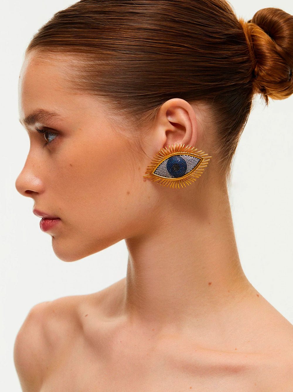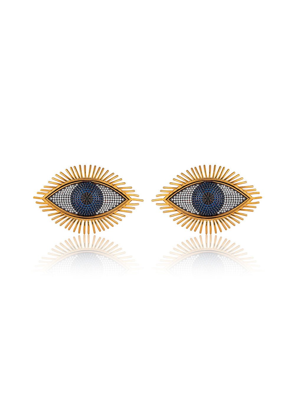 Begum Khan Karma crystal earrings featuring a beautiful Eyes figure, crafted from lustrous crystal gems in a deep navy hue. The intricate design of the Eyes figure adds a touch of elegance and sophistication to the earrings, while the crystal gems add a pop of sparkle and shine.