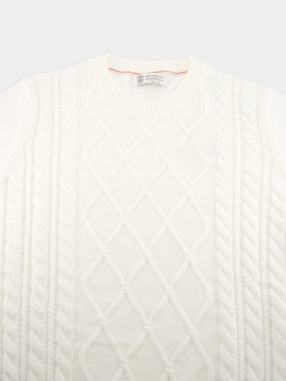 Cable Knit Crewneck Sweater crafted with premium cotton, this sweater offers a soft and breathable fit, perfect for colder days. Embrace the classic cable knit design, adding a touch of sophistication to your outfit. The crisp white hue makes it a versatile and chic choice, effortlessly pairing with various bottoms.