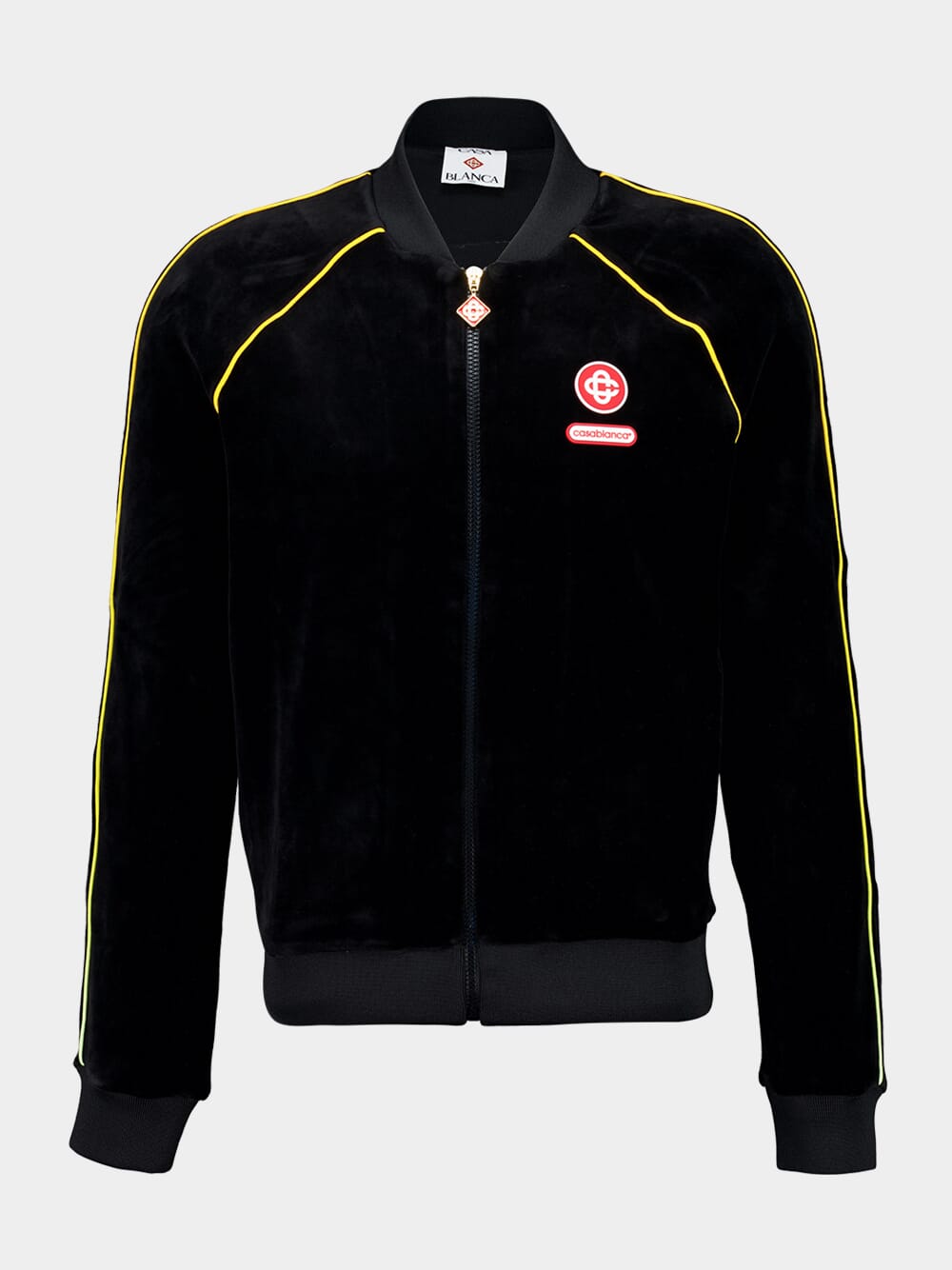 These Casablanca track pants are crafted in Portugal from plush black velour, tailored in a straight-leg silhouette with relaxed fit. Featuring gradient piping along the sides, pin-tuck seams, and a drawstring waistband, they combine elevated sportswear design with comfort. The interlocking CC emblem and Casablanca logo lend signature detailing, while practical side and back zip pockets complete the look.
