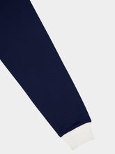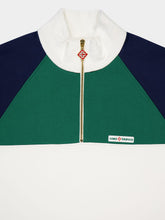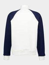 This color-block sweatshirt by Casablanca blends sporty style with casual sophistication. Crafted from soft cotton, it features a striking combination of white, forest green, and navy blue. The short front zipper leads to a stand-up collar, offering a versatile look, while the rubberized logo adds a subtle touch of branding. Designed with long raglan sleeves for ease of movement and finished with ribbed cuffs and hem, this sweatshirt is both stylish and comfortable. The terry cloth lining ensures warmth, making it a perfect layering piece for cooler days.