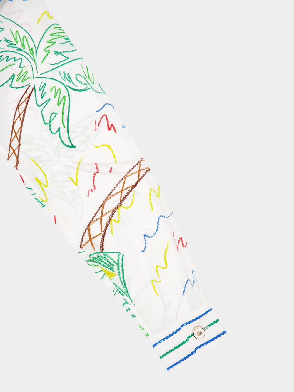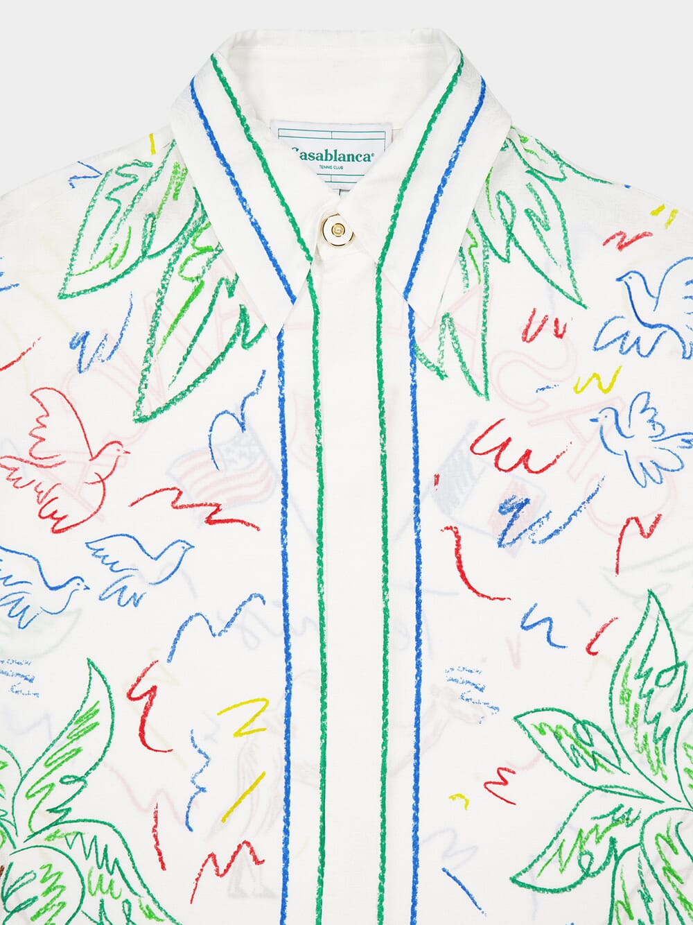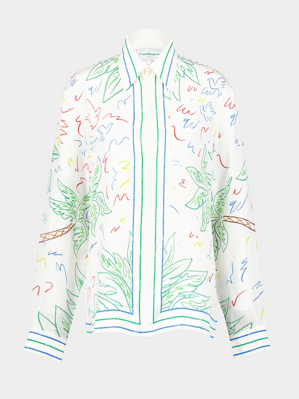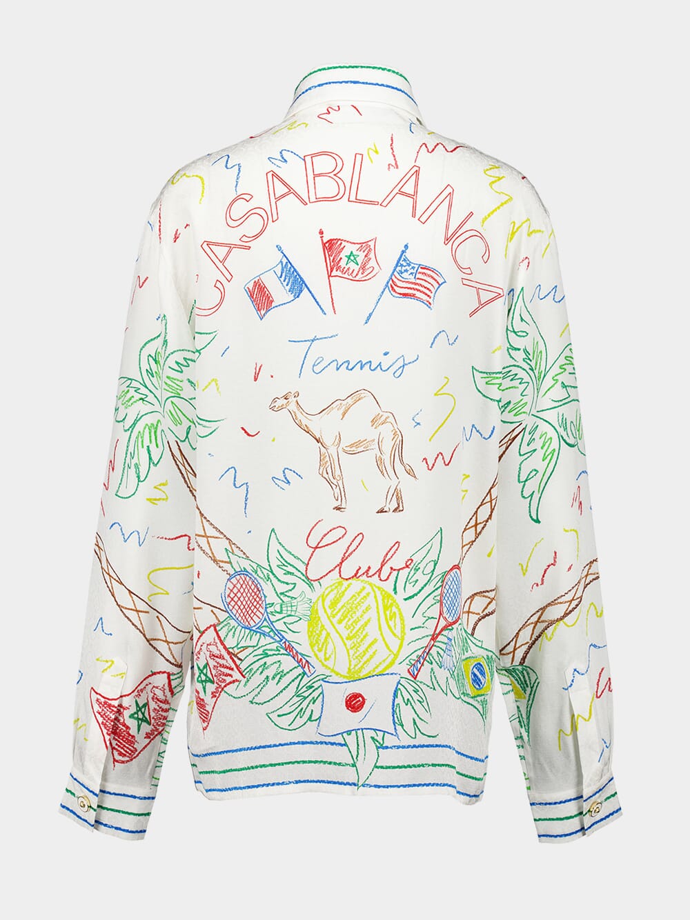 The Crayon Tennis Club silk shirt is a long-sleeve, all-over printed design crafted from monogram silk fabric, featuring the house's seasonal artwork with fluid movements that give the effect of a hand-drawn sketch. This piece is finished with button closure, gold rim enamel buttons on the cuffs and collar, and stripe details on the collar, cuffs, hem, and placket. Perfect for adding a unique, artistic touch to your wardrobe.
