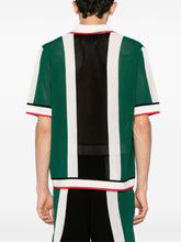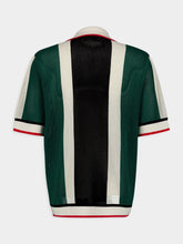 This short-sleeve striped mesh shirt draws inspiration from the vibrant colors of the Nigerian flag. It is meticulously crafted from a knitted organic cotton fabric, ensuring both sustainability and breathability. The shirt is adorned with the house's signature diamond logo patch, a ribbed collar, cuffs, placket, and hem, providing a textured contrast. The look is completed with distinctive gold rim pearl buttons for a luxurious finish. Ideal for a fashion-forward individual with a penchant for bold, cultural expressions.