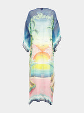 The Danse De La Mer Silk Kaftan is a flowing, lightweight silhouette crafted from luxurious printed silk. Featuring wide sleeves, elegant side slits, and a V-neckline with a delicate string tie, it showcases hand-painted coastal motifs created exclusively for the collection. A breezy, sophisticated choice for seaside retreats or chic resort styling.