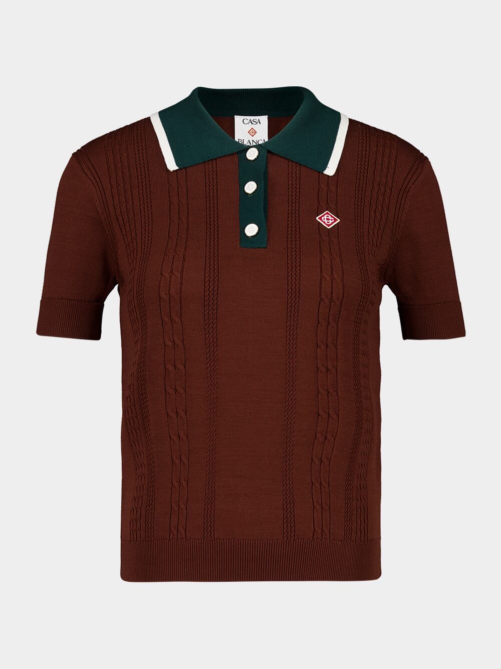 This dark brown cable knit polo shirt from Casablanca combines classic style with a modern twist. Crafted from knitted cotton fabric, it features the house's signature diamond logo and is completed with flat shank CC logo buttons and a three-button placket. The contrast ribbed placket and collar, with white edge detailing, add a refined touch. Designed to be worn with coordinating cable knit mini shorts, this shirt is the perfect blend of comfort and style.
