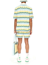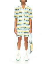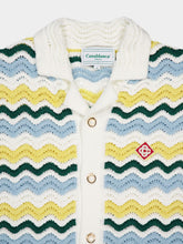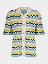 Wavy Boucle Shirt, a signature Casablanca piece that redefines casual elegance. Crafted from a soft textured open-weave crochet fabric, this shirt offers a distinctive and luxurious feel. The gold rim pearl button closure, open collar, and short sleeves add a touch of opulence to the design. Finished with a Casablanca Paris branded label, this shirt is designed for a classic fit, marrying comfort with sophisticated style.