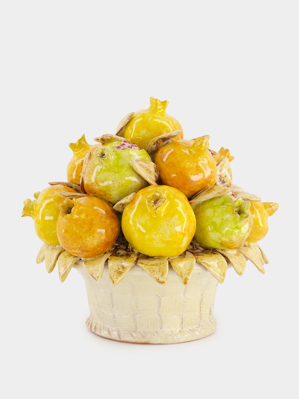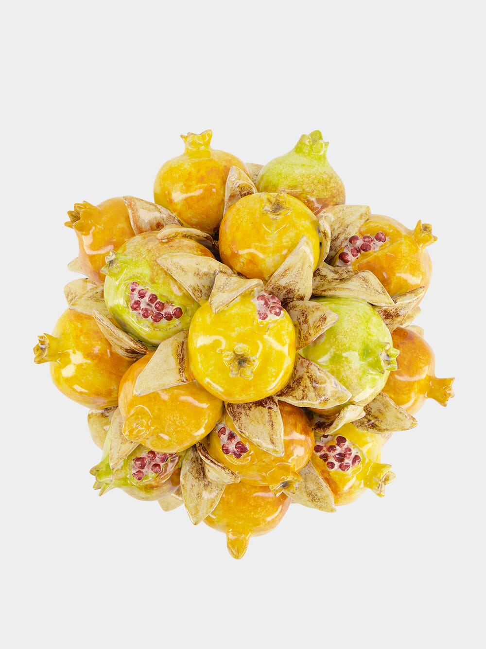 This exquisite ceramic centerpiece features a vibrant arrangement of pomegranates, adding a touch of elegance and natural beauty to any table setting. The intricate detailing and rich colors of yellow, green, and red create a captivating visual appeal. Perfect for enhancing your dining or living area, this handcrafted piece embodies both artistry and sophistication, making it an ideal addition to both modern and traditional interiors.