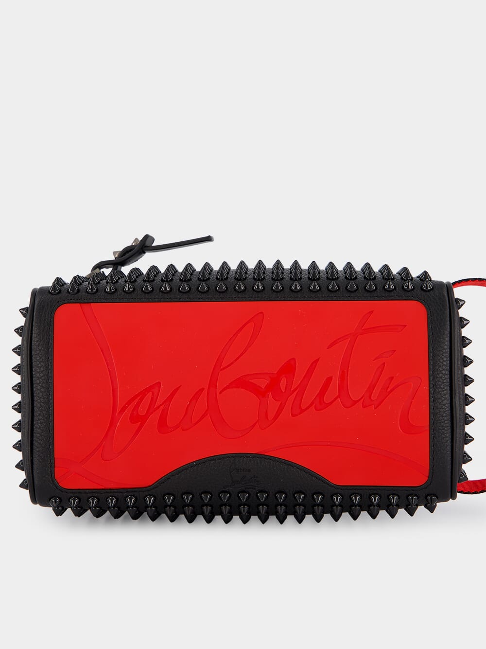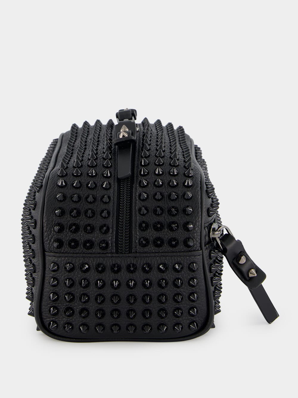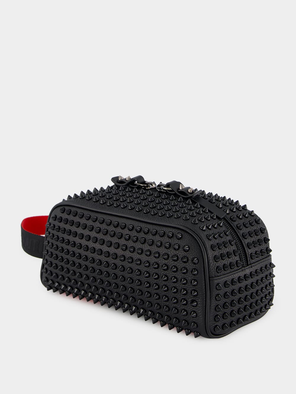 Christian Louboutin Blaster black grained leather beauty bag adorned with all-over black glossy spikes, a signature red rubber sneaker sole, a jersey CL embossed handle and a front zip pocket.