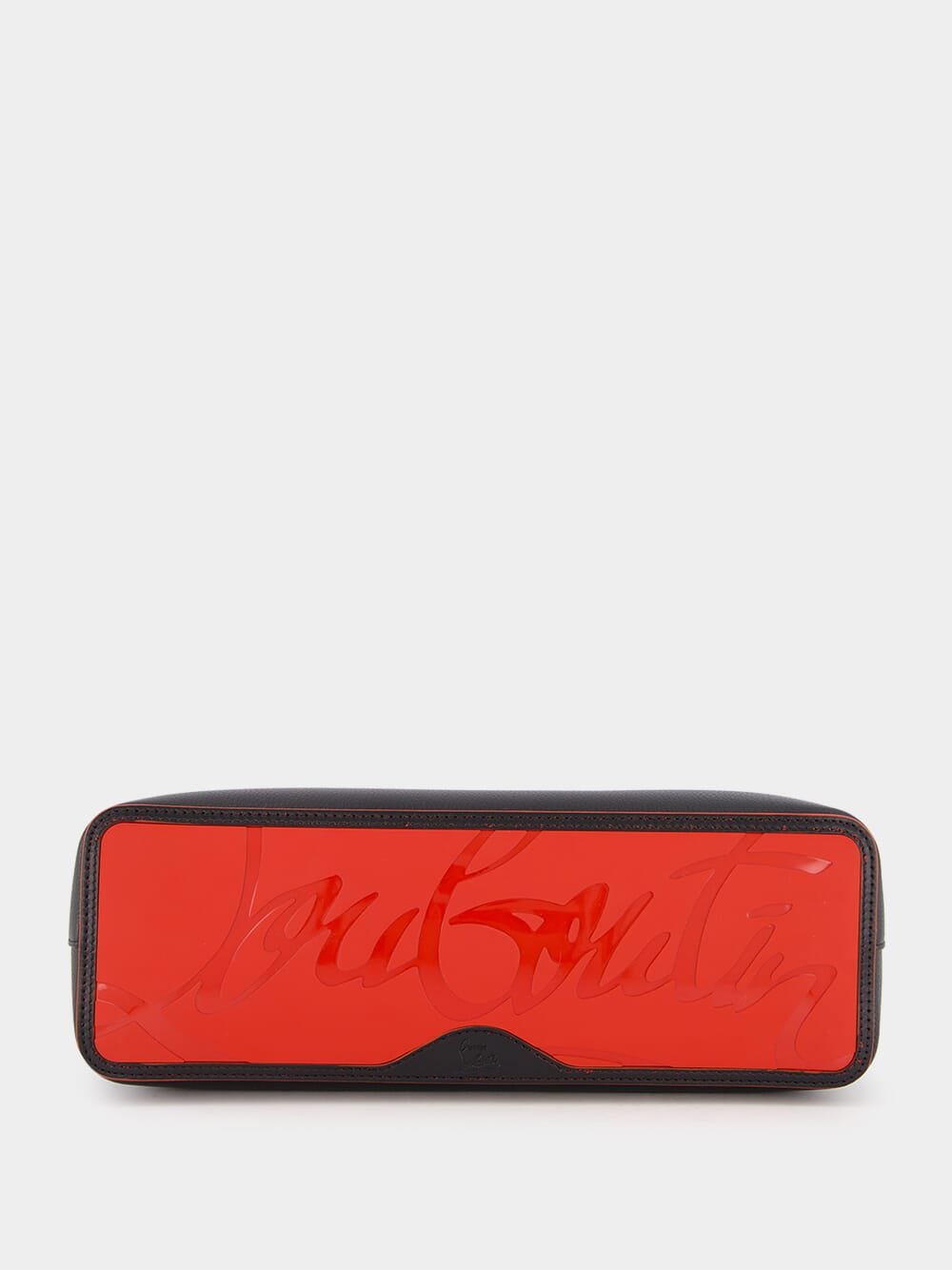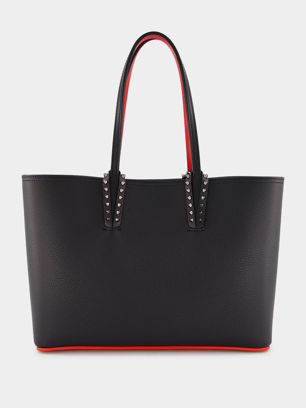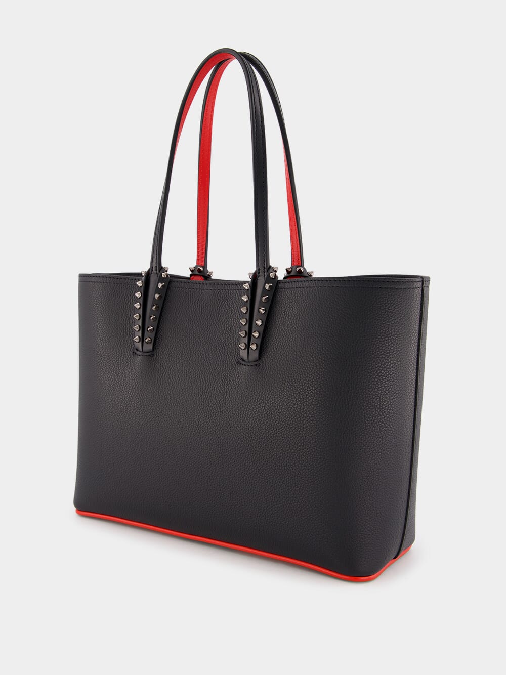 Christian Louboutin Cabata black grained leather small tote bag with silver metal studs and hook closure, double leather handles and red rubber sole.