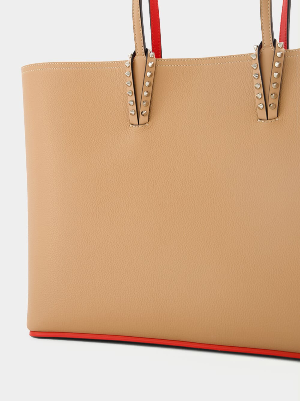 Christian Louboutin Cabata leather tote bag crafted from supple leather, this tote bag features a beautiful pleated effect that is sure to catch the eye. Equipped with ultralight soles and flat straps, this tote bag is both comfortable and practical. The interior of the bag boasts a flat pocket, providing ample space for all your essentials. The iconic silver-tone spike embellishments add a touch of edginess to the overall design.