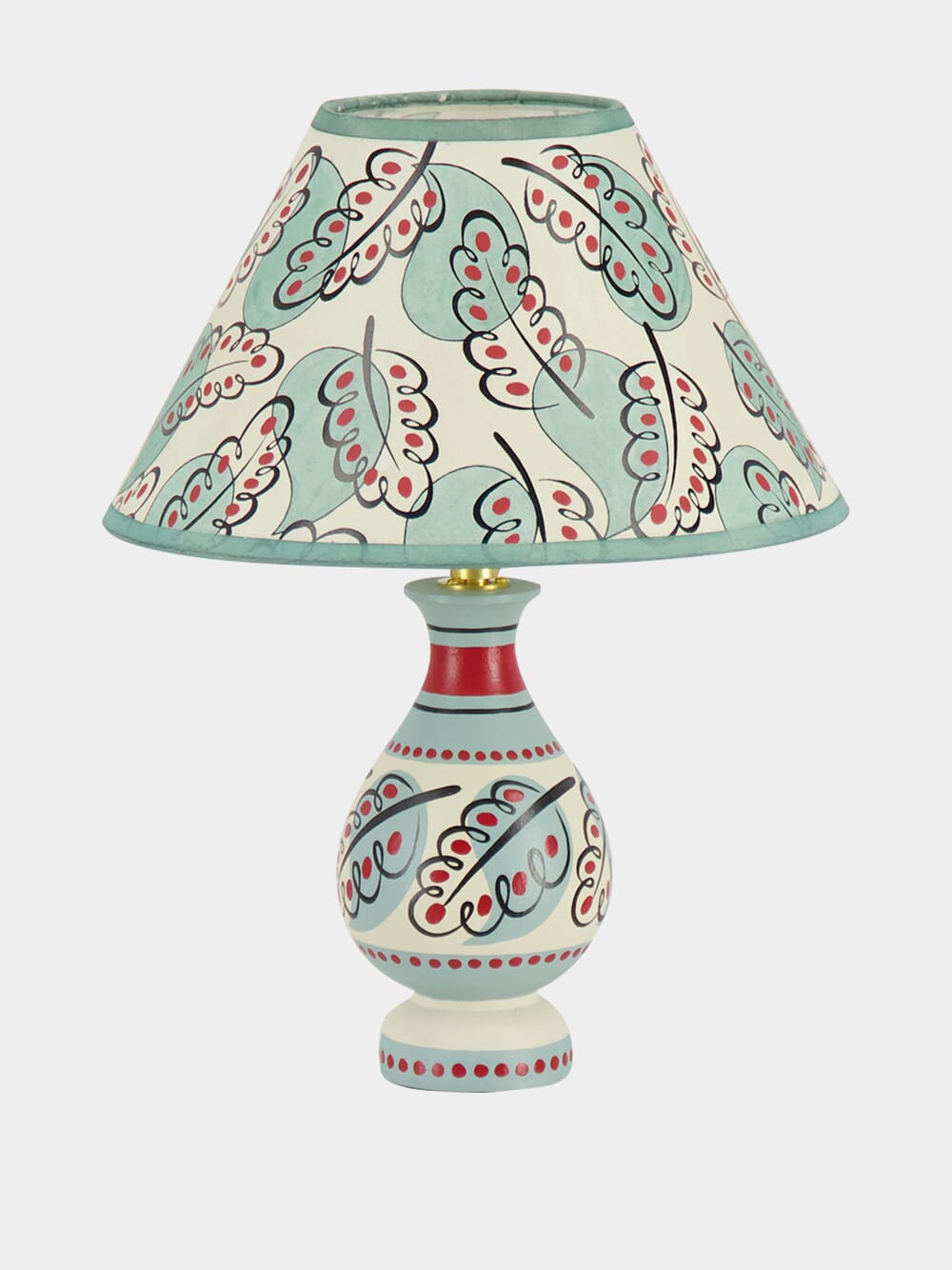 This hand-painted paper lampshade showcases a refined paisley leaf motif in soft pale blue and teal tones, accented with delicate red detailing. Set against a subtle neutral background, the flowing botanical forms create a harmonious balance between elegance and artistic expression. Individually crafted in the UK, each piece is unique and reflects exceptional craftsmanship. When illuminated, the colours intensify beautifully, casting a warm and inviting glow across refined interiors. Lamp Base sold separately.