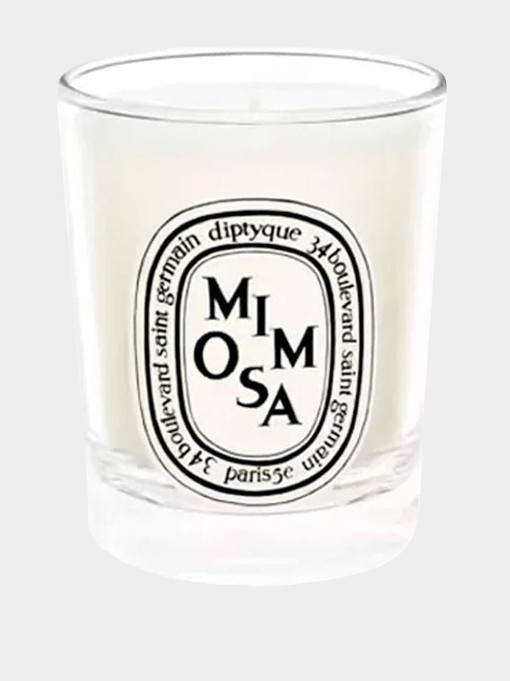 Diptyque Mimosa 70g candle with fresh mimosa notes, in a glass cup. Burning time: 20 hours
