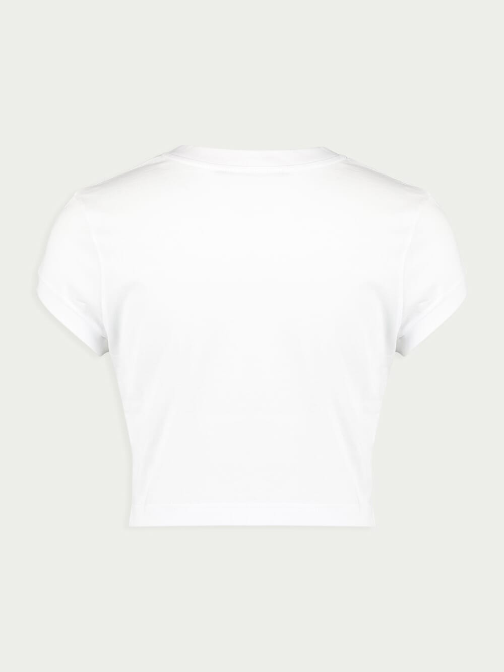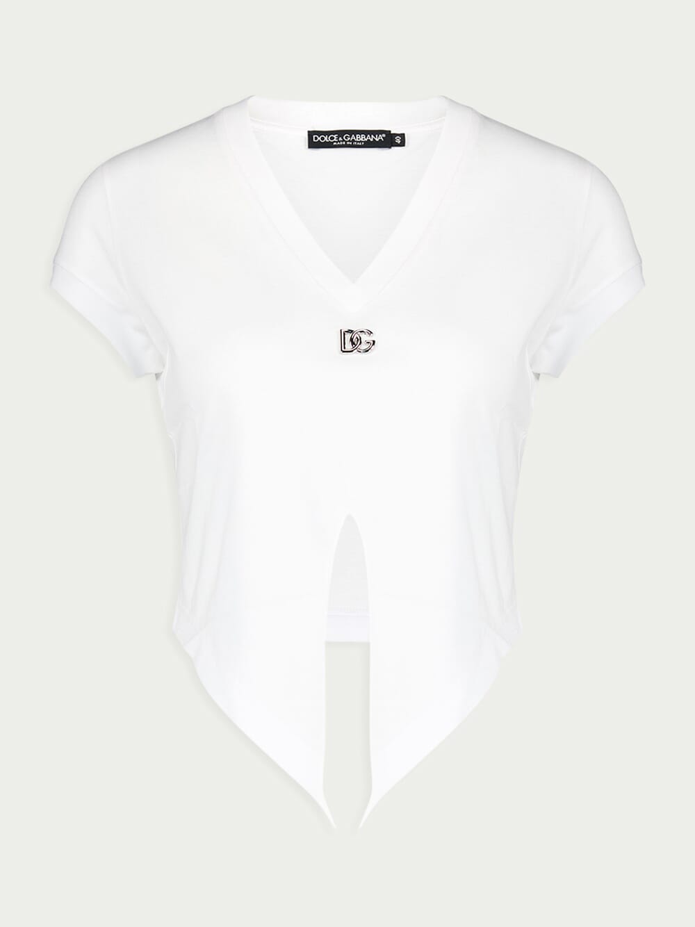 DG Knot Cotton Jersey T-Shirt, crafted from luxuriously soft cotton jersey. Experience unmatched comfort with its premium fabric and enjoy the trendy touch of a slightly cropped silhouette, perfect for modern styling. This fashion-forward gem is adorned with eye-catching metal DG hardware and chic knot detailing on the front, elevating your look effortlessly.