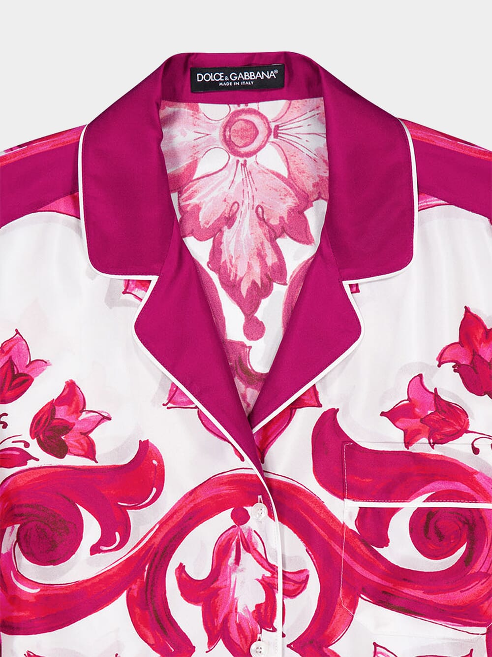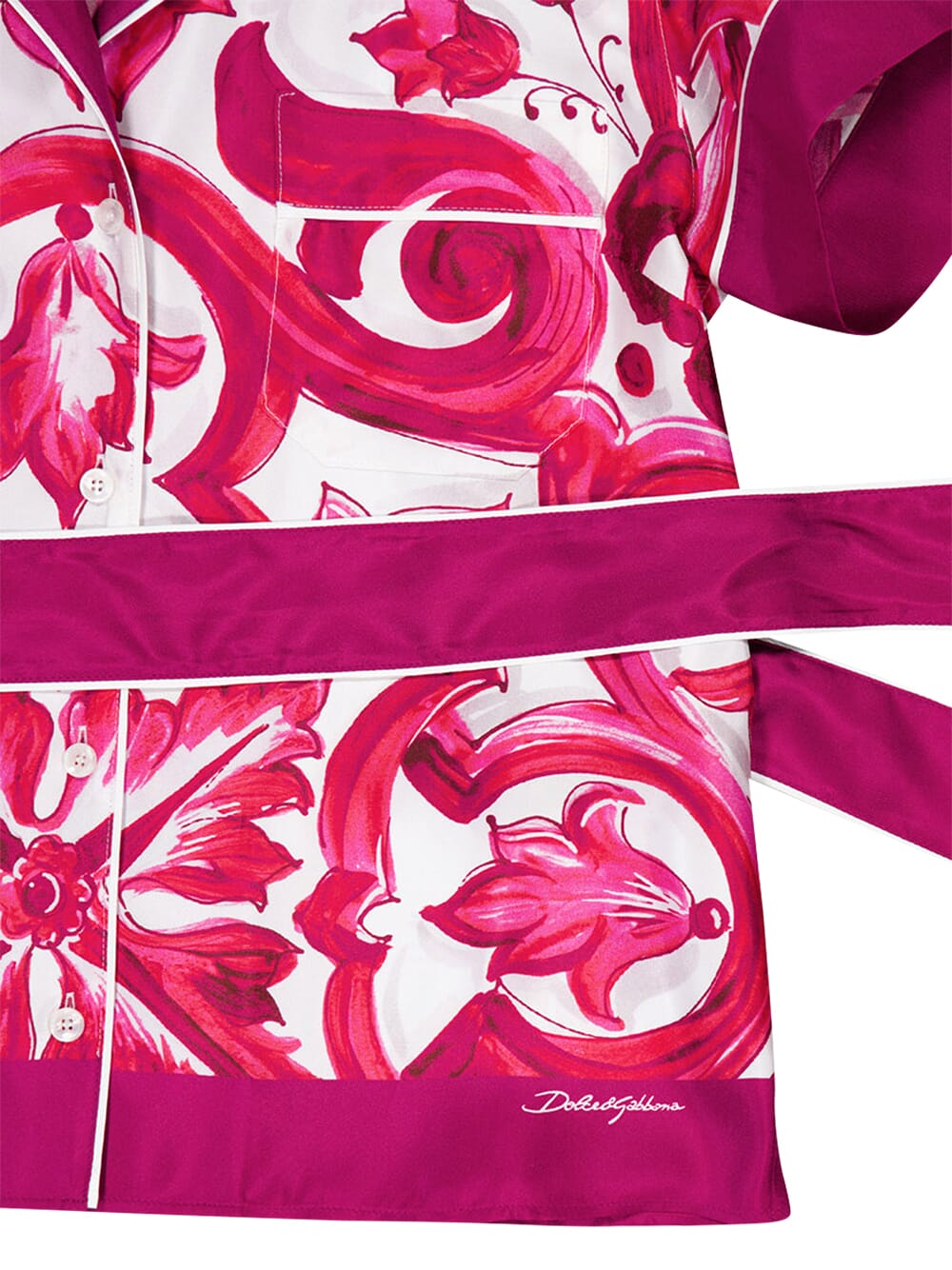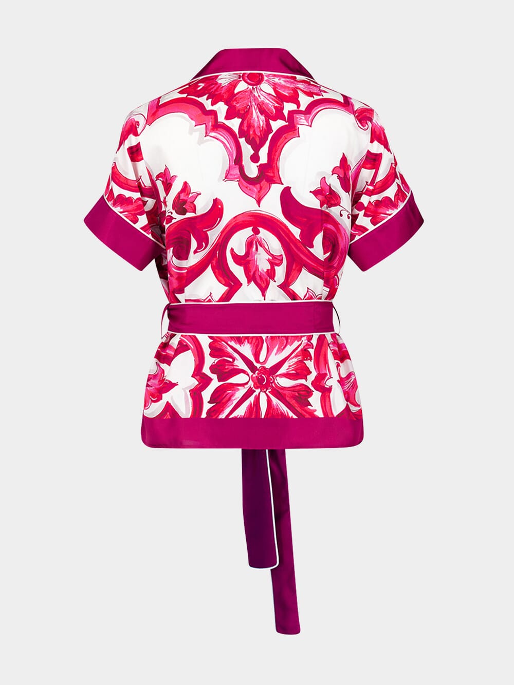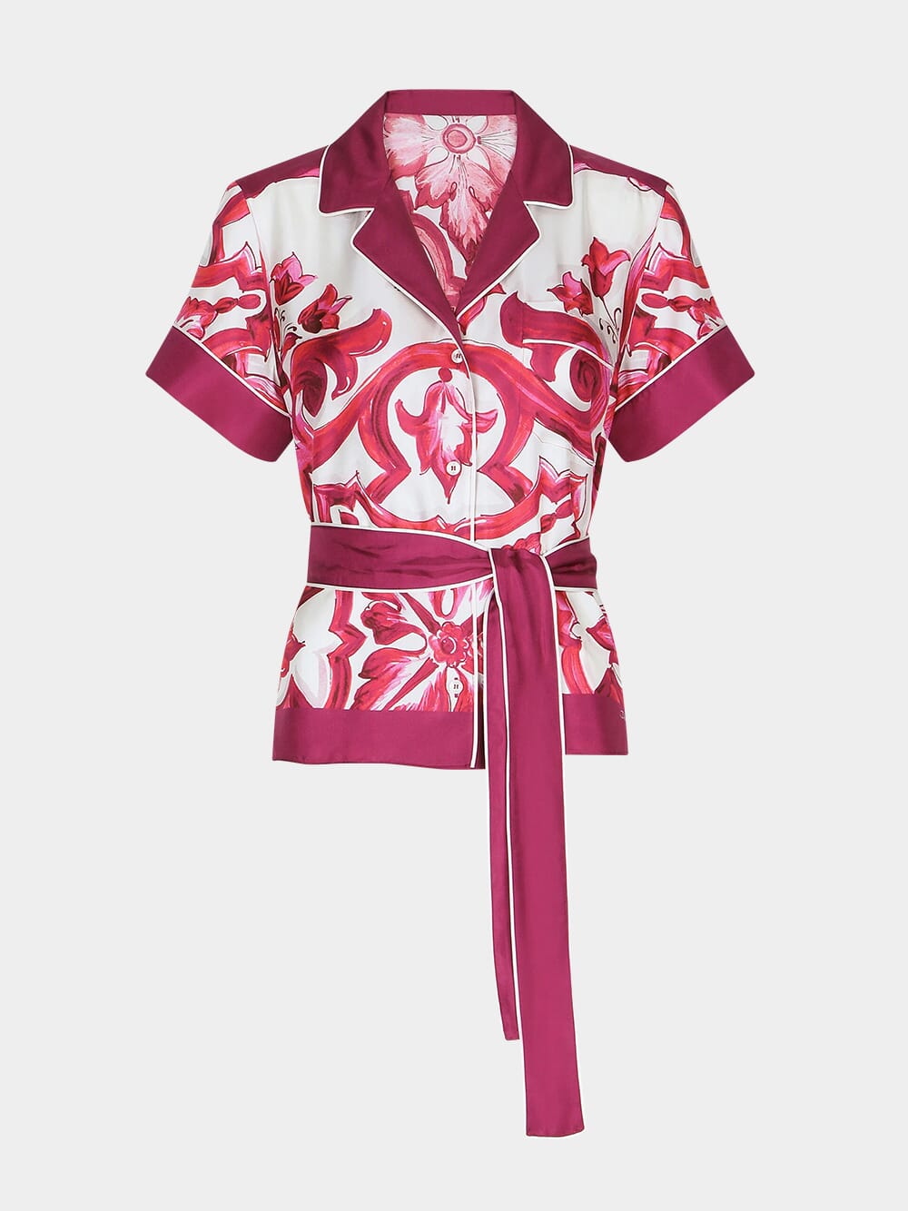 Majolica-Print Belted Silk Shirt, crafted from premium silk with a captivating Majolica print, this shirt exudes elegance and sophistication. The notched lapels and piped-trim detailing add a touch of refinement to the design. Embrace comfort with short sleeves and a front button fastening for easy wear. The belted waist cinches your silhouette, creating a flattering fit. With a straight hem, this shirt effortlessly combines style and versatility.