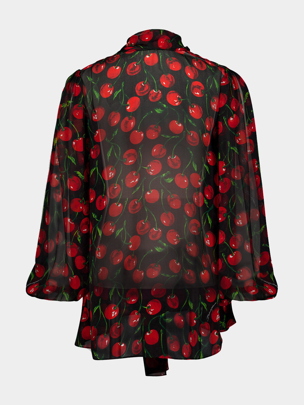 Cherry-Print Silk Blouse, a blend of elegance and style in one exquisite piece. The semi-sheer construction adds a touch of allure to your look, perfect for day or night. Adorned with an all-over graphic print, this blouse captures attention with its captivating design. An attached scarf enhances versatility and sophistication. With a V-neck, long sleeves, and elasticated cuffs, this blouse offers a refined silhouette. The straight hem adds a timeless touch, making it an essential addition to your wardrobe.