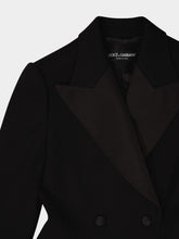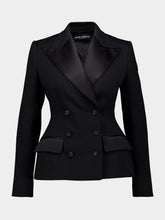 This elegant black double-breasted Dolce tuxedo jacket is crafted in double stretch wool, blending timeless tailoring with a feminine silhouette. Featuring peak lapels, satin-covered buttons, and flap pockets, it showcases refined details like padded hips for added structure and a stretch silk satin lining for comfort. This luxurious piece in Nero Sicilia black redefines sophistication with its understated glamour, making it perfect for formal or evening occasions.