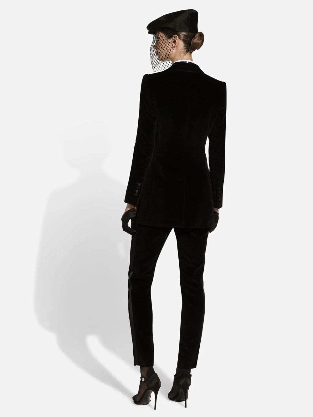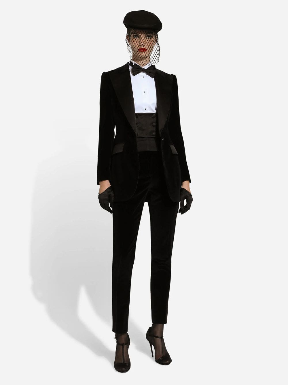 This refined black Turlington tuxedo jacket in cotton velvet exudes elegance with its structured silhouette and luxurious detailing. Featuring duchesse peak lapels, long sleeves, and flap pockets, this single-breasted jacket is lined with silk satin for a smooth finish and fastens with a satin-covered button. Perfect for evening occasions, it represents the epitome of timeless sophistication.