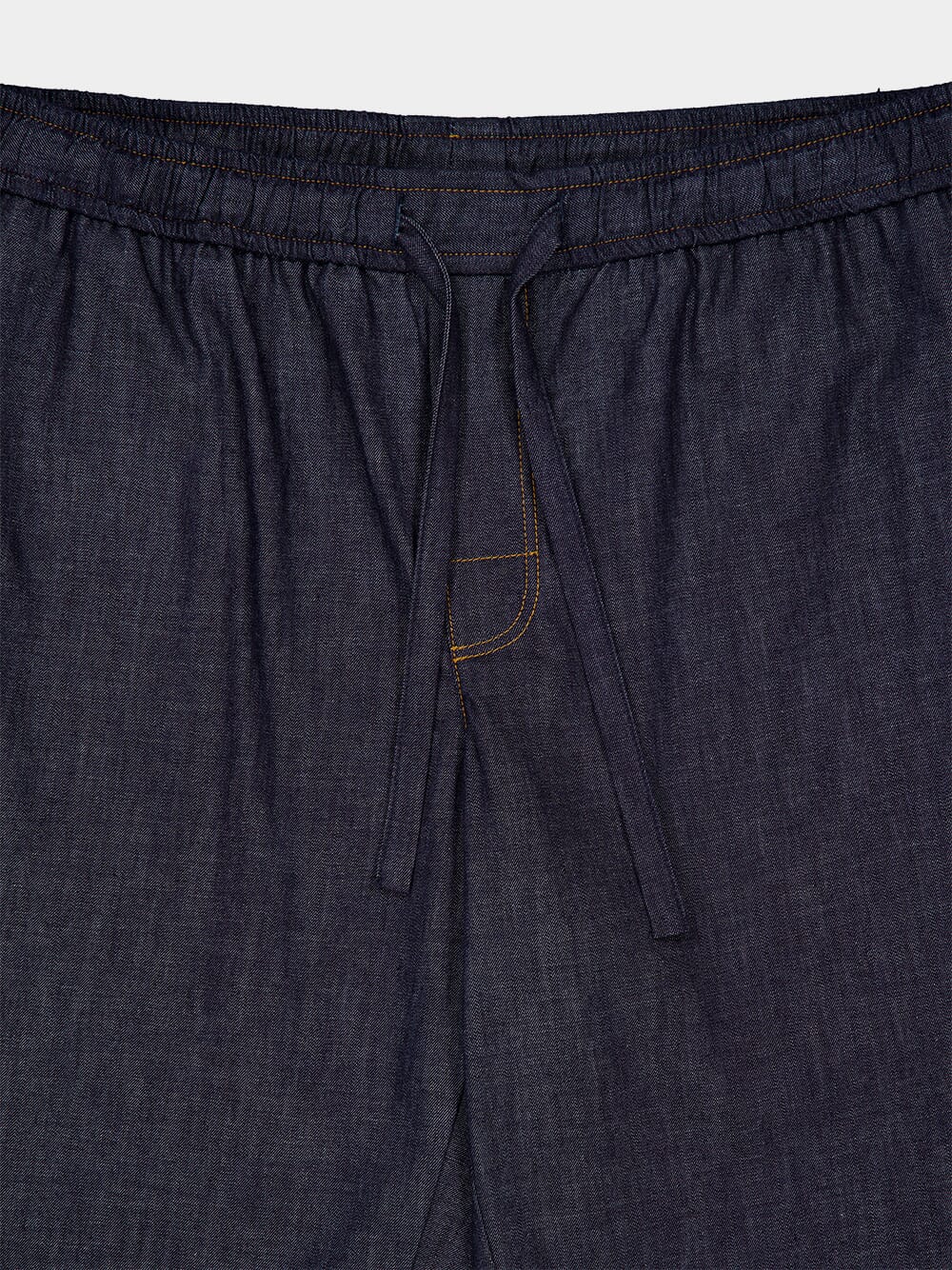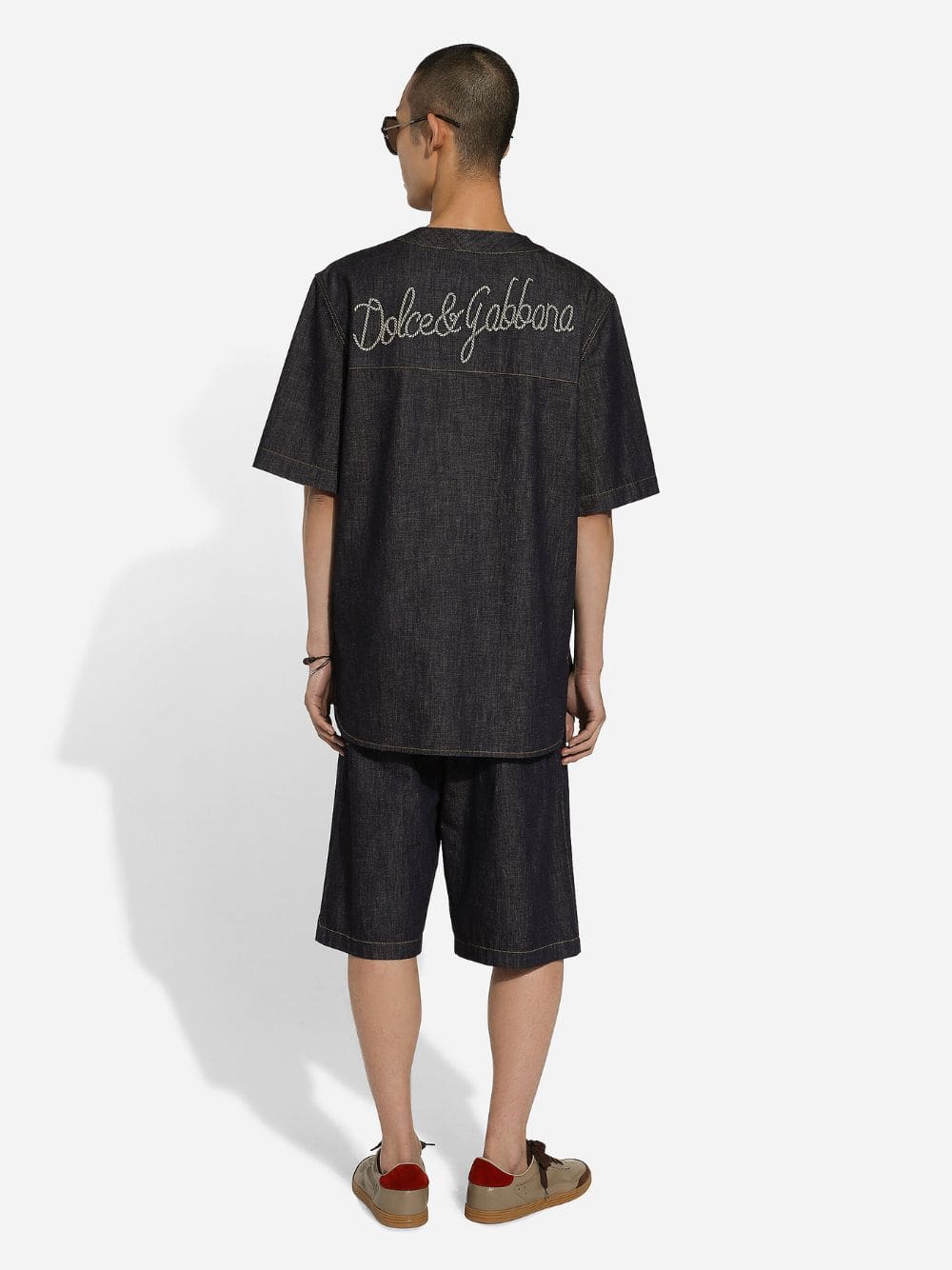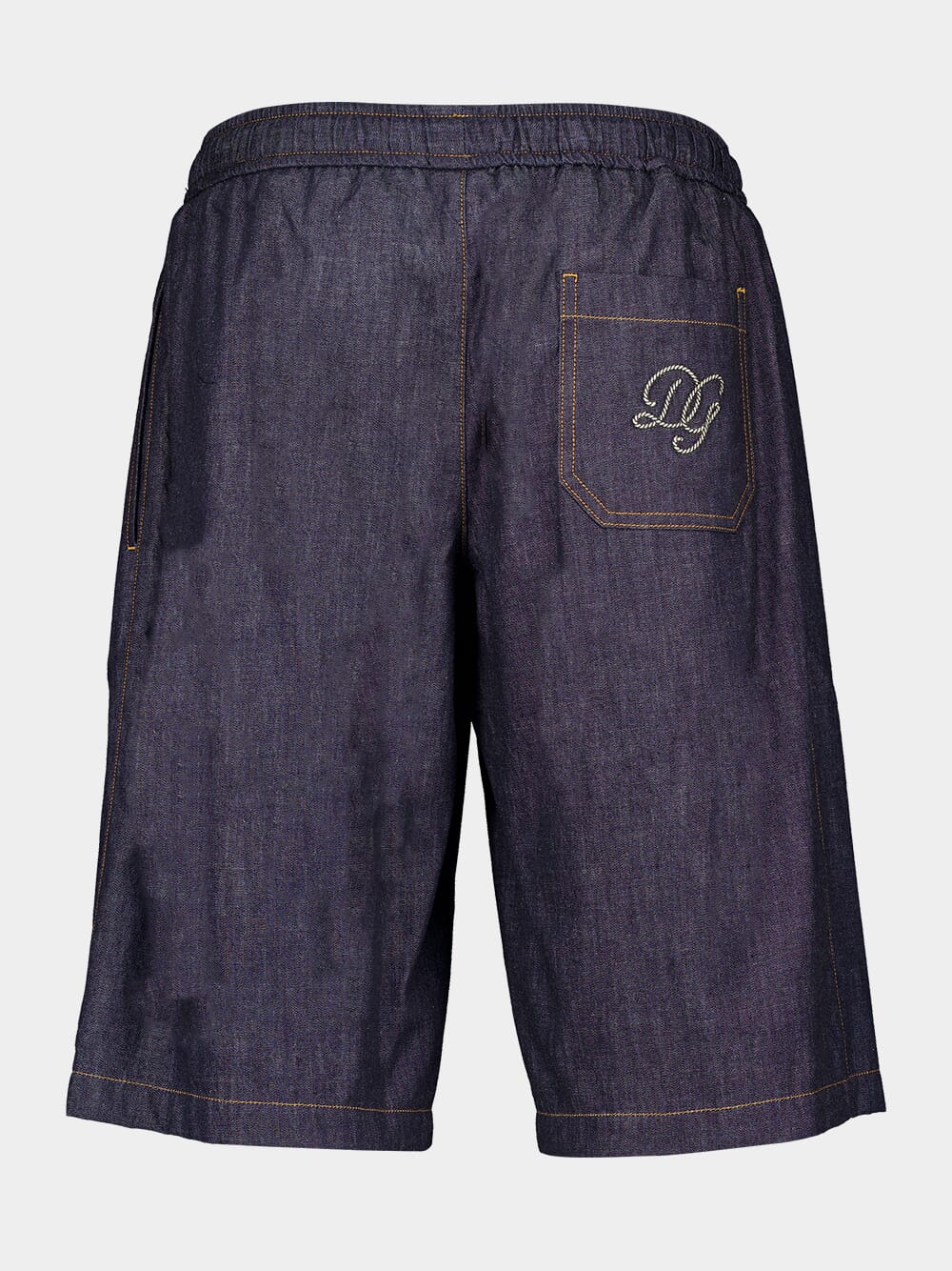 The Palermo collection symbolizes the connection between the Sicilian man and the island's pristine nature. Highlighted by warm hues such as sand, cream, and Nero Sicilia black, the collection features floral motifs and iconic prints. These Cotton Denim Jogging Shorts with Embroidery have been redesigned using new materials for a harmonious look. The shorts, in a classic blue, feature a regular fit, a stretch waistband with a drawstring, front slant pockets, and a buttoned patch pocket at the back.