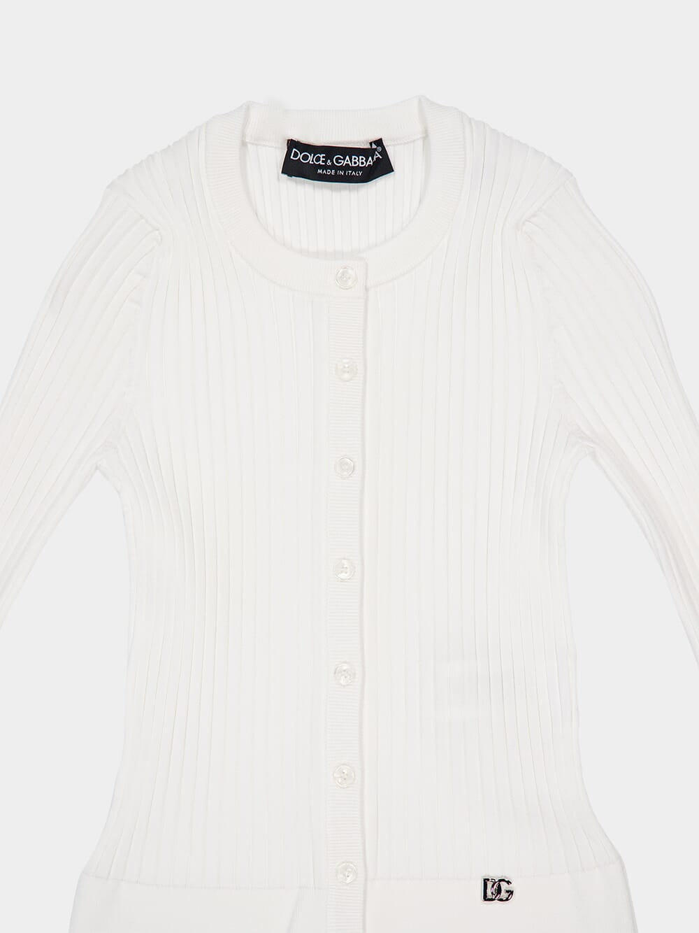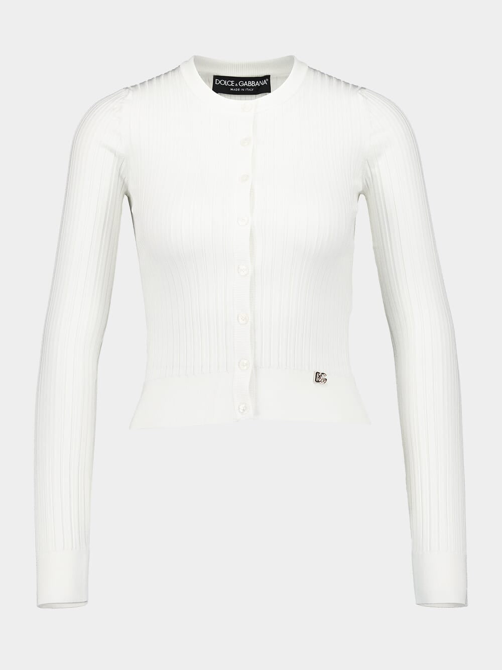 This ribbed viscose sweater, featuring a metal DG logo pin, captures the vibrant essence of summer light reflecting off Sicilian homes by the sea. The pure white hue adds a bold edge to the brand's iconic pieces. This 18-gauge knit sweater has a round neck, long sleeves, and a form-fitting silhouette, accentuated with fine-rib trims for an extraordinarily feminine and vibrant look.