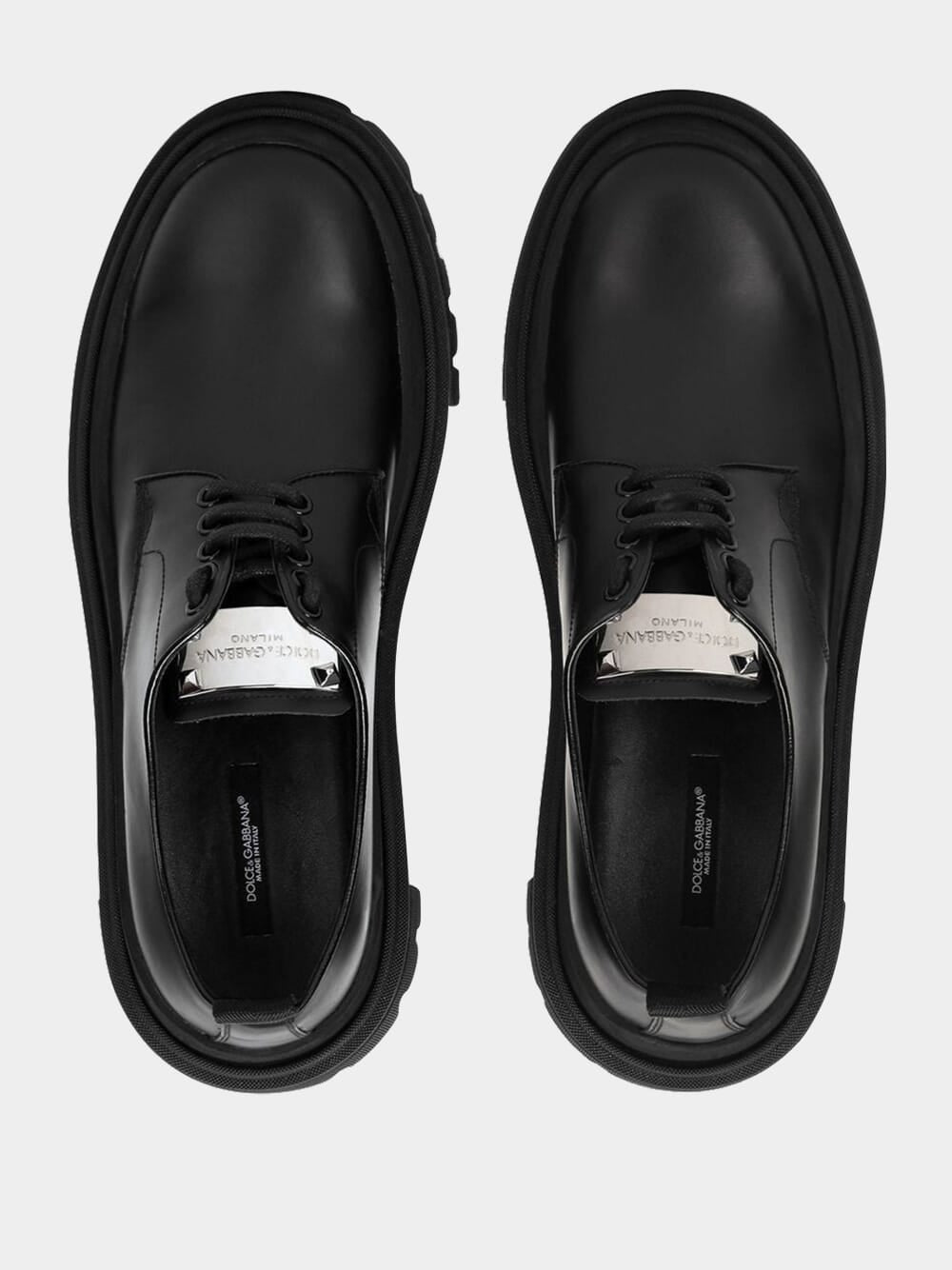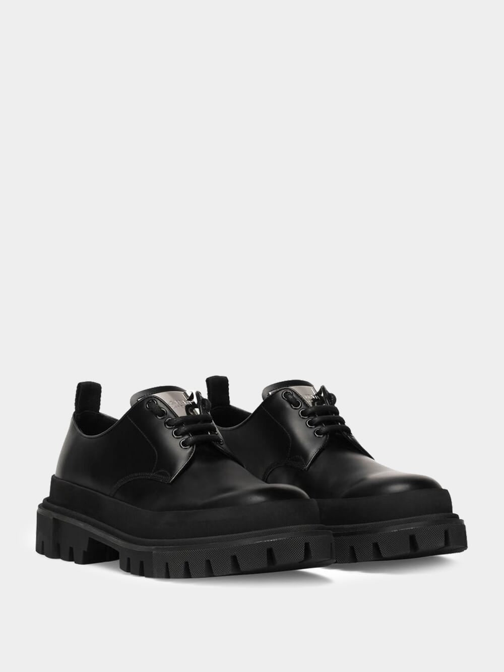 Dolce & Gabbana black rubberized leather derby shoes with waxed tubular laces inserted in the rubber sole.