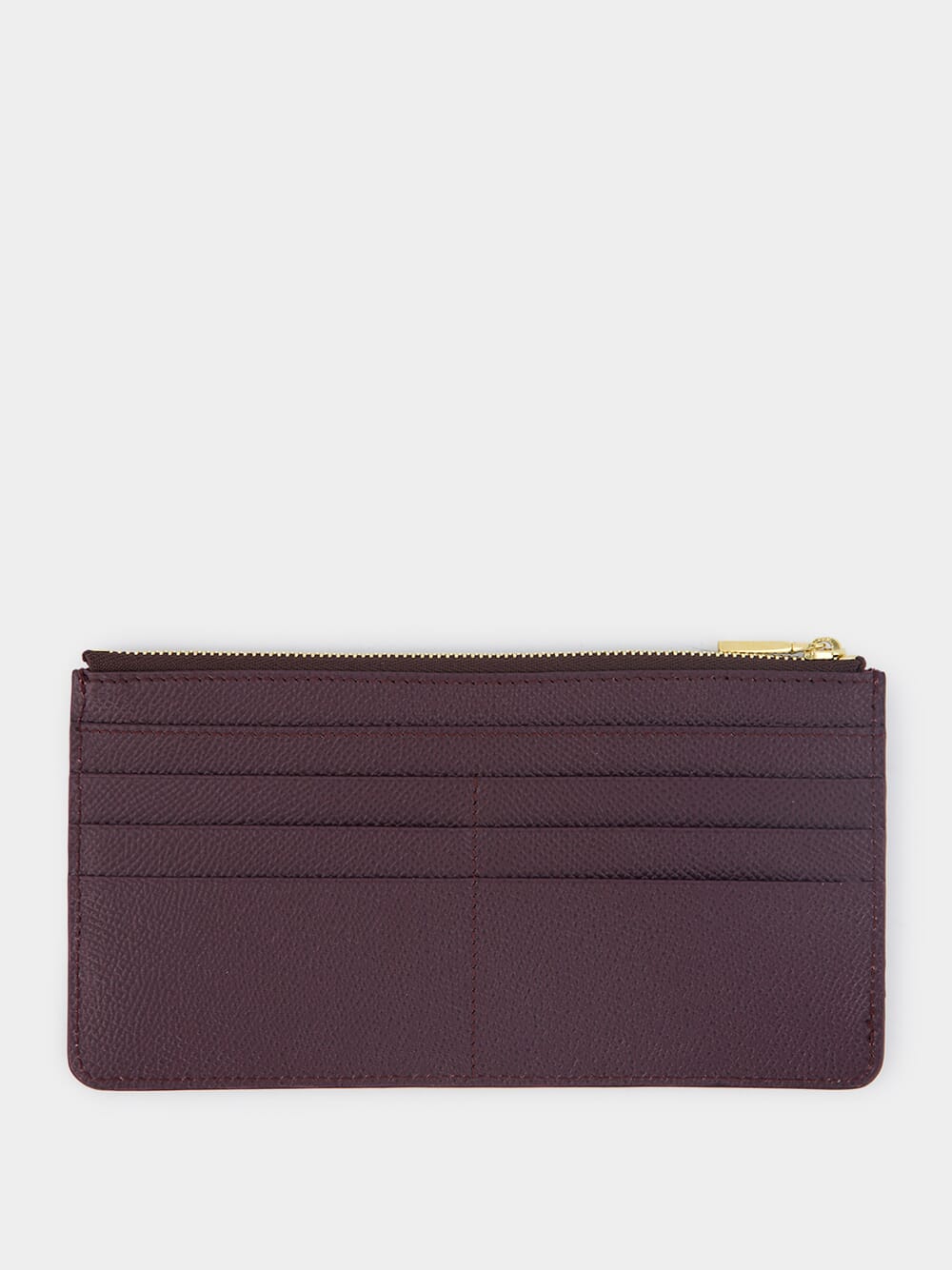 Branded Plate Calfskin Cardholder, featuring six card slots and two flat pockets for sleek organization. The flat front pocket adds practicality, while a zipped coin pocket with a branded slider on top enhances functionality with a touch of luxury. |
