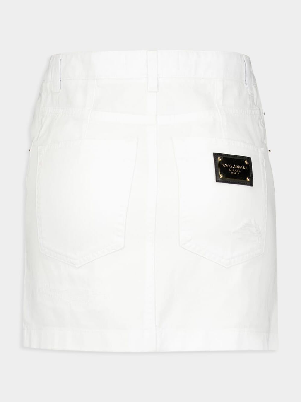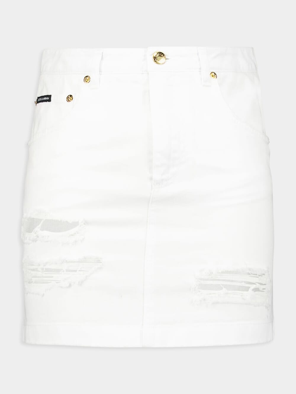 Distressed Denim Miniskirt, featuring a trendy distressed effect that adds edge to your look. The logo patch to the rear adds a touch of authenticity and flair. Complete with belt loops, a front button, and zip fastening, this skirt ensures a secure and stylish fit. The classic five pockets offer both fashion and functionality, making it a versatile addition to your wardrobe. With a thigh-length design, this miniskirt is the epitome of chic.