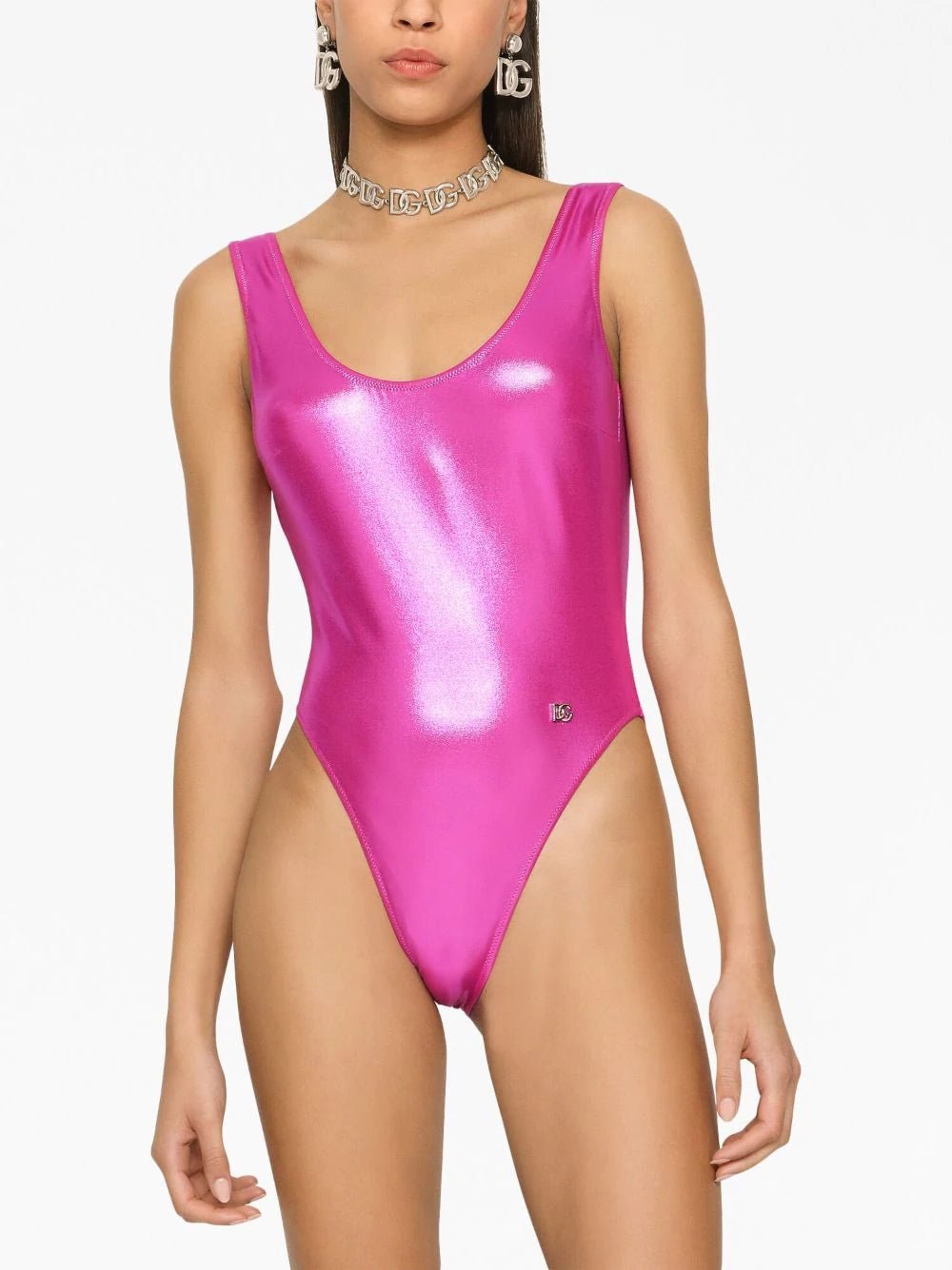 High-Shine One-Piece Swimsuit, a must-have for the beach or poolside. Crafted with a stretch-design, this swimsuit offers a comfortable and flattering fit. The high-shine finish adds a touch of glamour, while the silver-tone logo lettering exudes sophistication. With a classic scoop neck and sleeveless design, this swimsuit combines style and comfort seamlessly. Be sure to try on swimwear over your own garments.