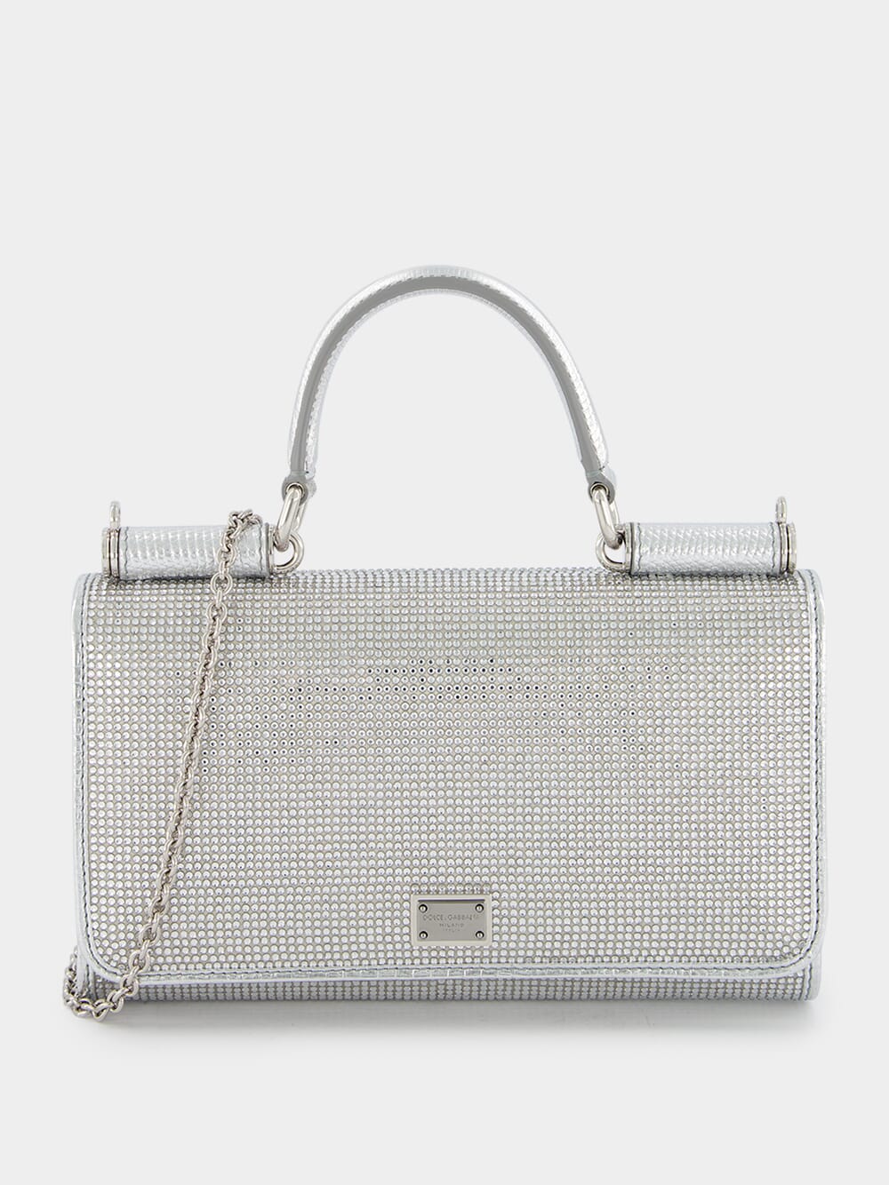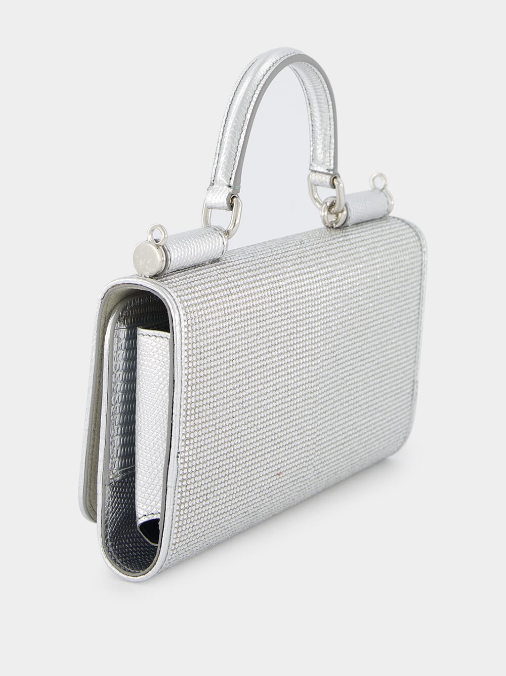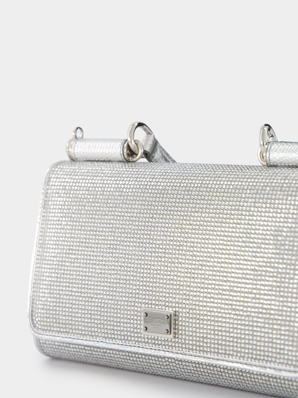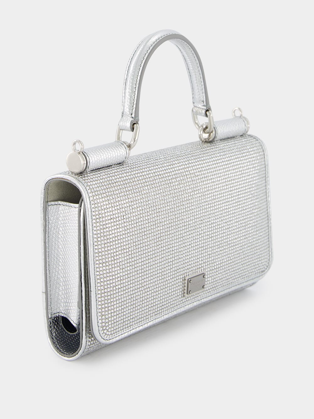 KIM x DOLCE & GABBANA Rhinestone Satin Phone Bag, a fusion of luxury and style crafted from exquisite silk satin. Adorned with dazzling rhinestone embellishments, the palladium-plated hardware and logo plaque add opulence to the design. The single rolled top handle showcases an embossed lizard-skin effect with a captivating foiled finish. Transform your look effortlessly with the detachable chain-link shoulder strap, while the foldover top with press stud fastening ensures security. Inside, discover the convenience of internal card slots and a flat central pocket – a harmonious blend of fashion and functionality.