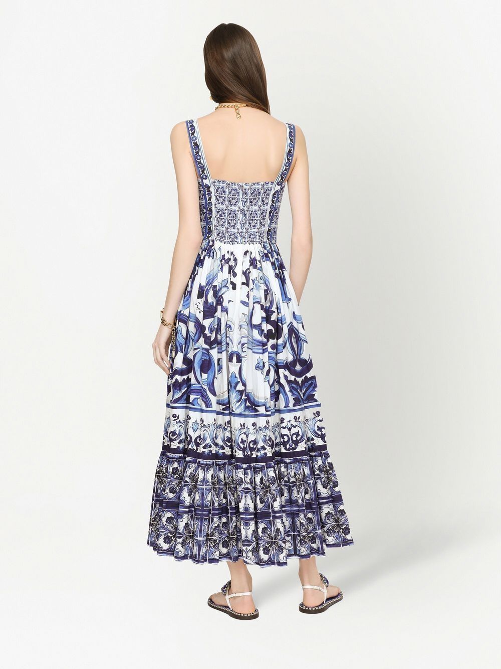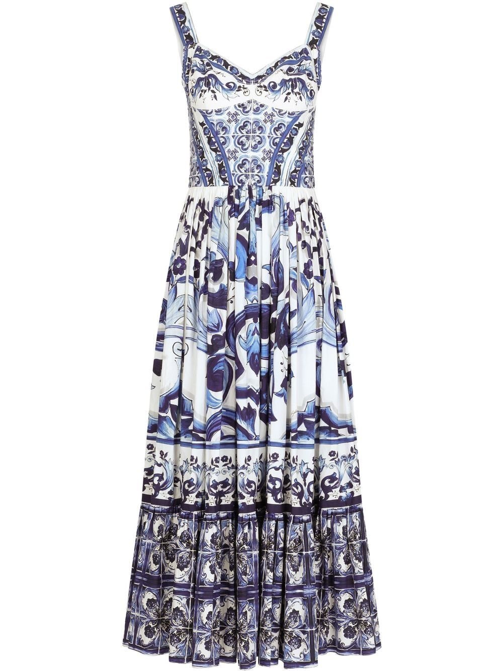 Dolce & Gabbana white and blue poplin cotton sleeveless dress with Majolica print, sweetheart neckline with knot detail and pleated skirt.