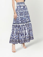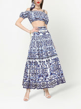 Dolce & Gabbana blue and white silk maxi skirt with Majolica print, high waist and flared design.
