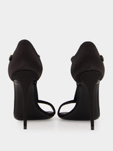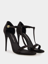 These elegant black satin T-bar sandals from Dolce & Gabbana, known as the Keira, exude sophistication with a minimalist yet refined design. Featuring a slender 105-mm heel and a delicate T-bar strap adorned with the iconic DG logo, they are crafted with a luxurious kidskin insole and a branded leather sole for ultimate comfort. These Italian-made sandals are perfect for evening events or formal occasions, embodying Italian craftsmanship and timeless style.