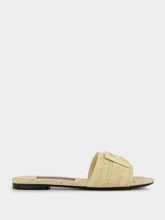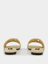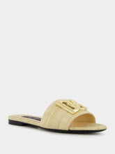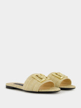These flat mules are a testament to summer elegance, beautifully woven from raffia and adorned with a bold gold-tone logo. Their natural color palette and effortless slip-on style make them perfect for seaside strolls or urban explorations.