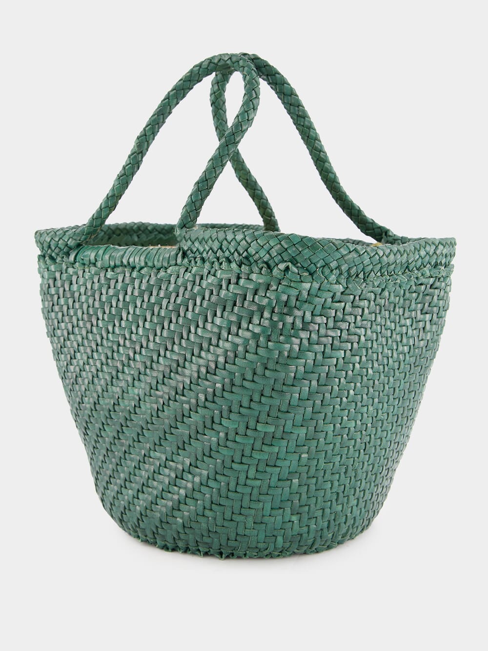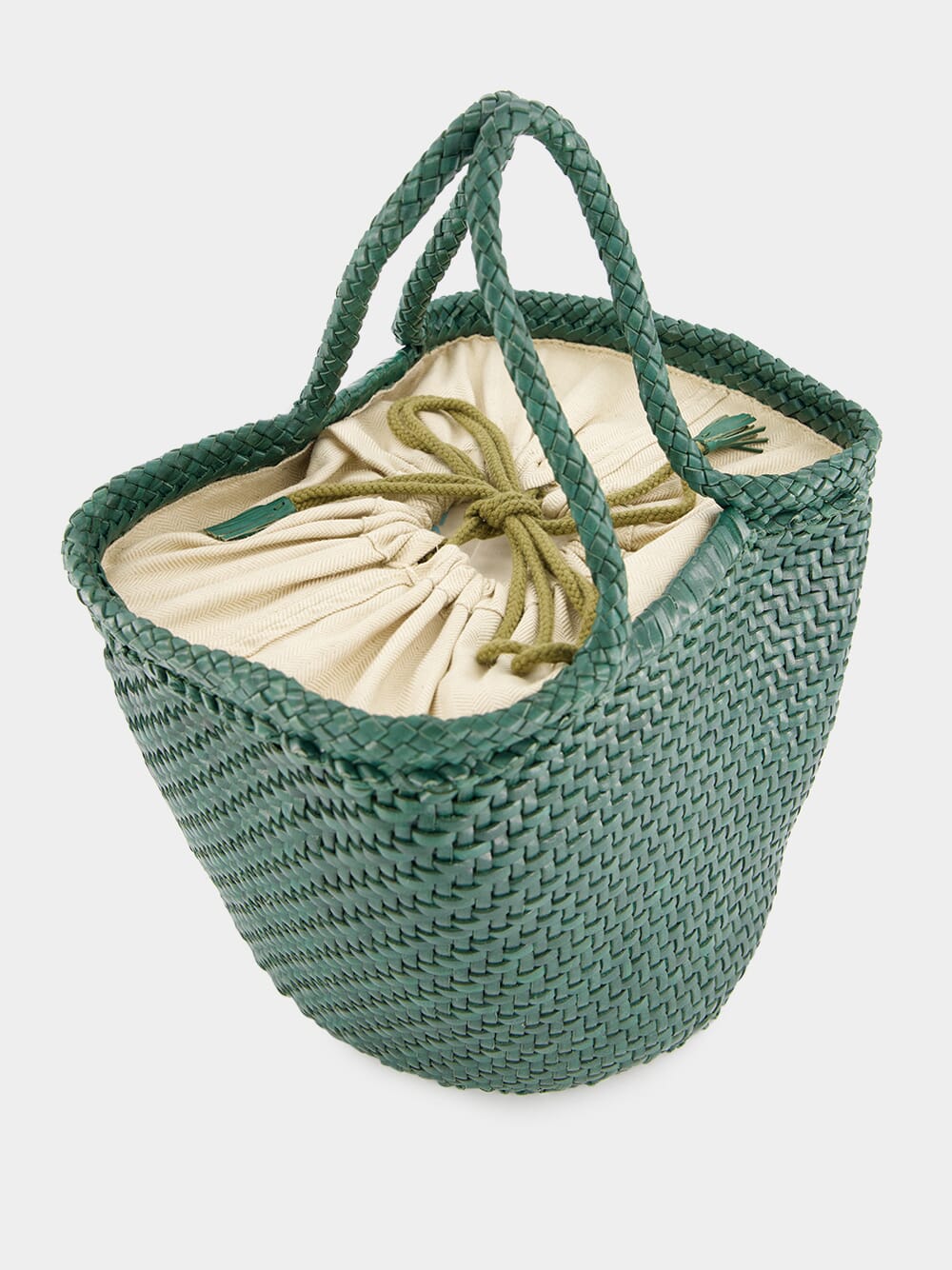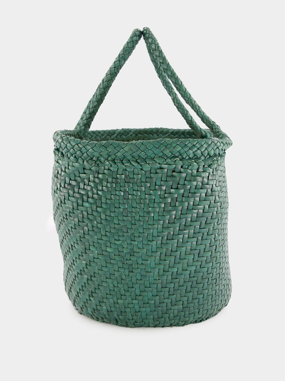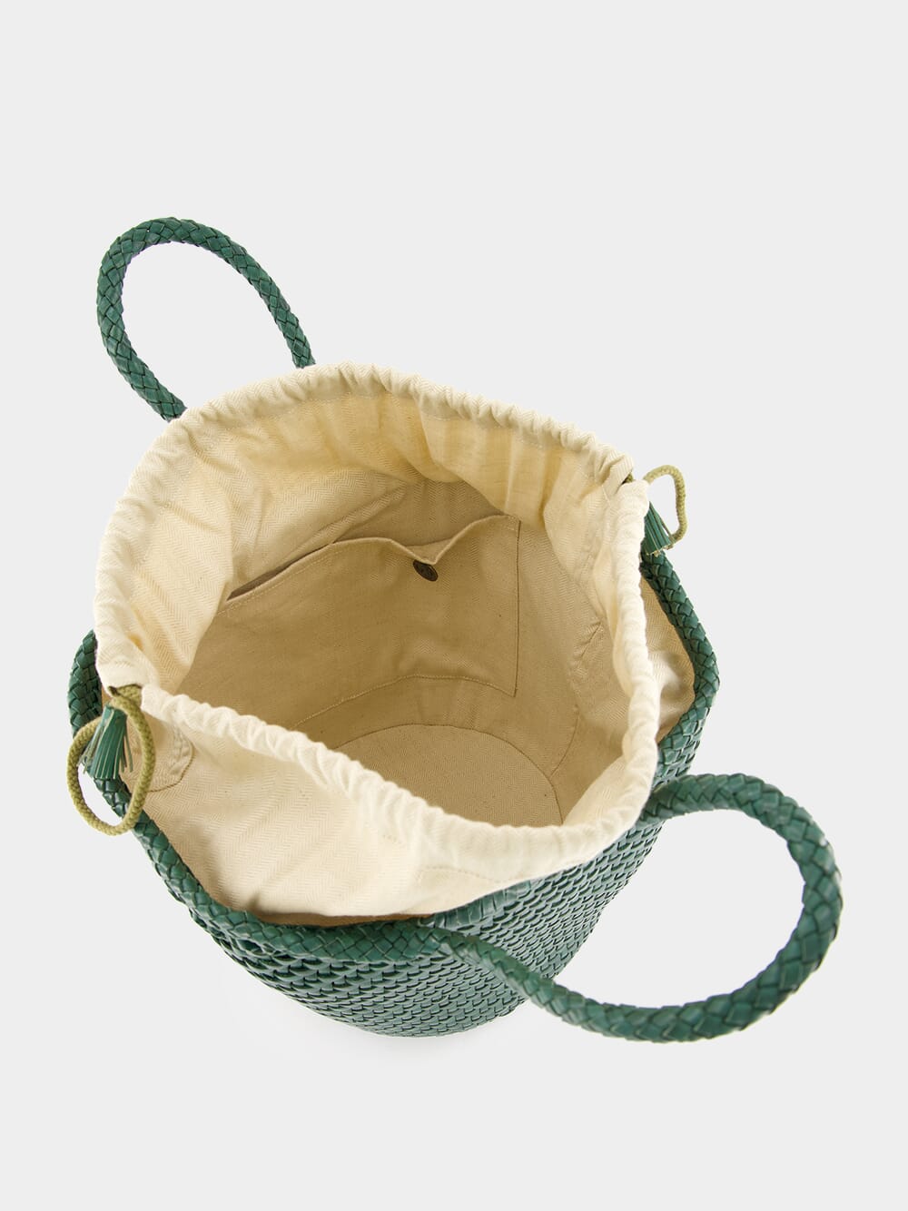 Introducing "Martha" - an elegant woven leather basket handbag designed for convenient hand-carrying. Martha includes a cotton drawstring sewn at the top for secure closure, maintaining its sleek look. The diagonal weaving pattern, reminiscent of traditional wicker baskets, seamlessly combines classic aesthetics with modern practicality. Each Dragon Diffusion bag features a hand-sewn antiqued St. Christopher medal charm, paying homage to the patron saint of travelers and serving as our brand's seal of authenticity.