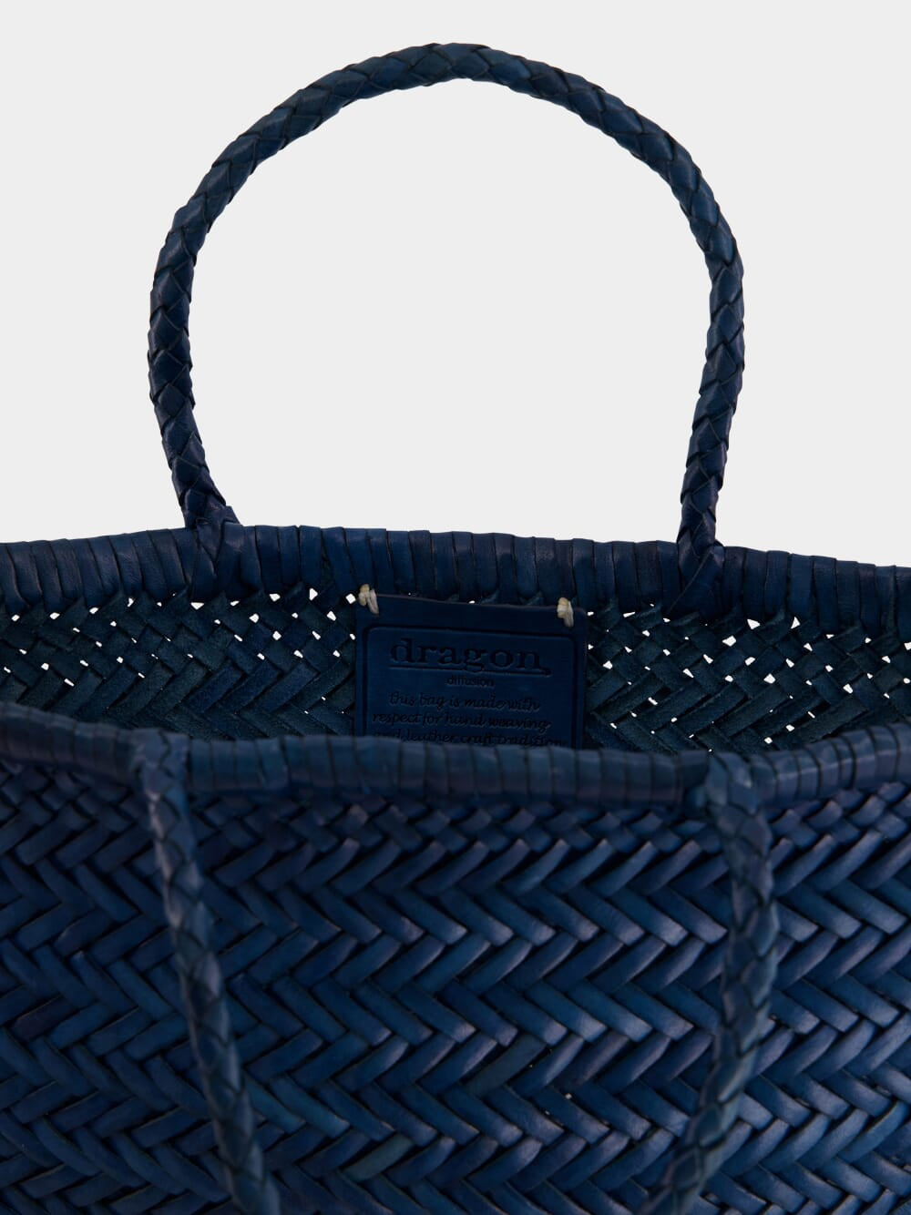 The "Mini Flat Gora" bag in a steel blue hue is a stunning handwoven piece crafted from premium buffalo calf leather. Showcasing a traditional basket-weave design with a refined twist at the top, this mini bag is both stylish and functional. Its compact and lightweight structure is perfect for carrying just the essentials, making it ideal for both casual and formal occasions. Inside, a hand-sewn antiqued St. Christopher medal charm—a nod to the patron saint of travelers—serves as Dragon Diffusion's signature of authenticity.
