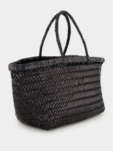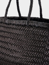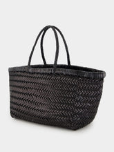 The Triple Jump Small in black is Dragon Diffusion’s iconic best-seller. Handwoven in smooth buffalo calf leather with a distinctive diagonal chevron pattern, this compact tote is crafted in one seamless piece. Unlined with an open top, it embodies authentic basket weaving tradition. Perfect for everyday use, it includes a hand-sewn St. Christopher medal inside, the brand’s signature seal.