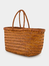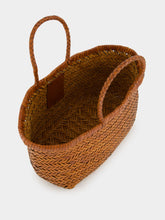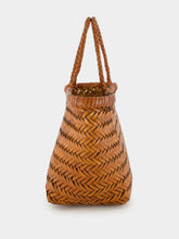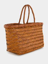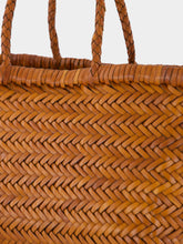 The Triple Jump Small in Tan with Black Edge is Dragon Diffusion’s iconic best-seller. Handwoven in smooth buffalo calf leather with a distinctive diagonal chevron pattern, this compact tote is crafted in one seamless piece. Unlined with an open top, it embodies authentic basket weaving tradition. Perfect for everyday use, it includes a hand-sewn St. Christopher medal inside, the brand’s signature seal.