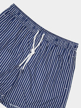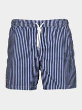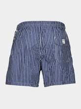 Embrace summer in true Italian style with our Madeira swim trunks, featuring a cadet blue riga pattern. These slightly shorter designer swim trunks are made entirely from select, recycled polyester and dry out in just 90 seconds. They come with an elastic belt and drawstring for a perfect fit and are adorned with a vibrant, summery pattern, making them a stylish and sustainable choice for beachwear.