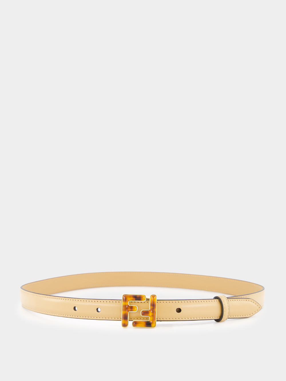 This thin Fendi belt is crafted from beige leather and features a loop and FF stud buckle. The buckle is embellished with a Havana detail and gold-finish metalware, adding a touch of elegance. Perfect for accentuating your waistline with a sophisticated flair.