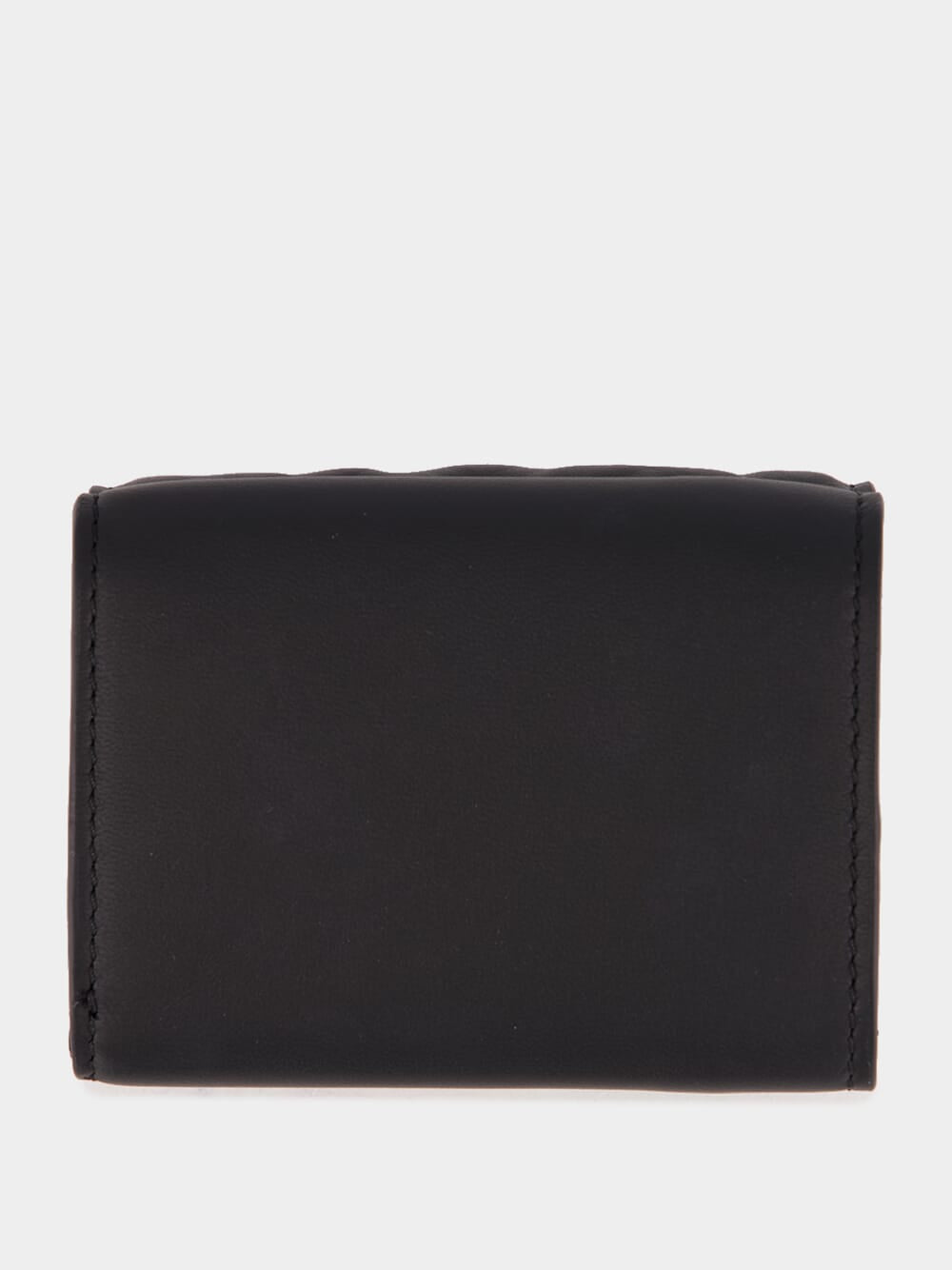 Compact Baguette micro tri-fold wallet made from luxurious black nappa leather. This elegant accessory features a spacious internal banknote compartment, three concealed card slots, and an external coin purse with a press-stud fastening. Embellished with an embossed FF motif and gold-finish metalware, this wallet is a refined blend of functionality and sophistication, perfect for everyday use.