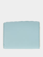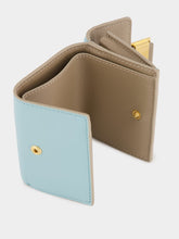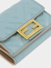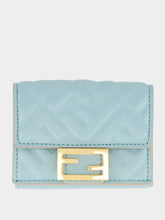 The Light Blue Nappa Leather Baguette Micro Trifold wallet is an elegant and compact accessory. Made of soft light blue nappa leather with an embossed FF motif, it features a large internal banknote compartment, three concealed card holders, and an external coin purse with a press-stud fastening. Gold-finish hardware adds a luxurious touch, while the beige lining offers a subtle contrast.
