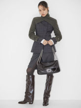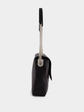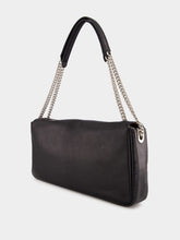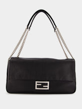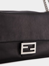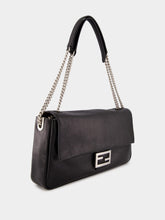 Iconic large Baguette bag in black leather with an oversize soft construction. It features a front flap with an FF clasp, a magnetic closure, and a brown suede-lined interior with a zip pocket. The bag is adorned with palladium-finish metalware and can be worn on the shoulder or cross-body, thanks to the slide-chain shoulder strap. This versatile piece is perfect for adding a touch of elegance to any outfit.