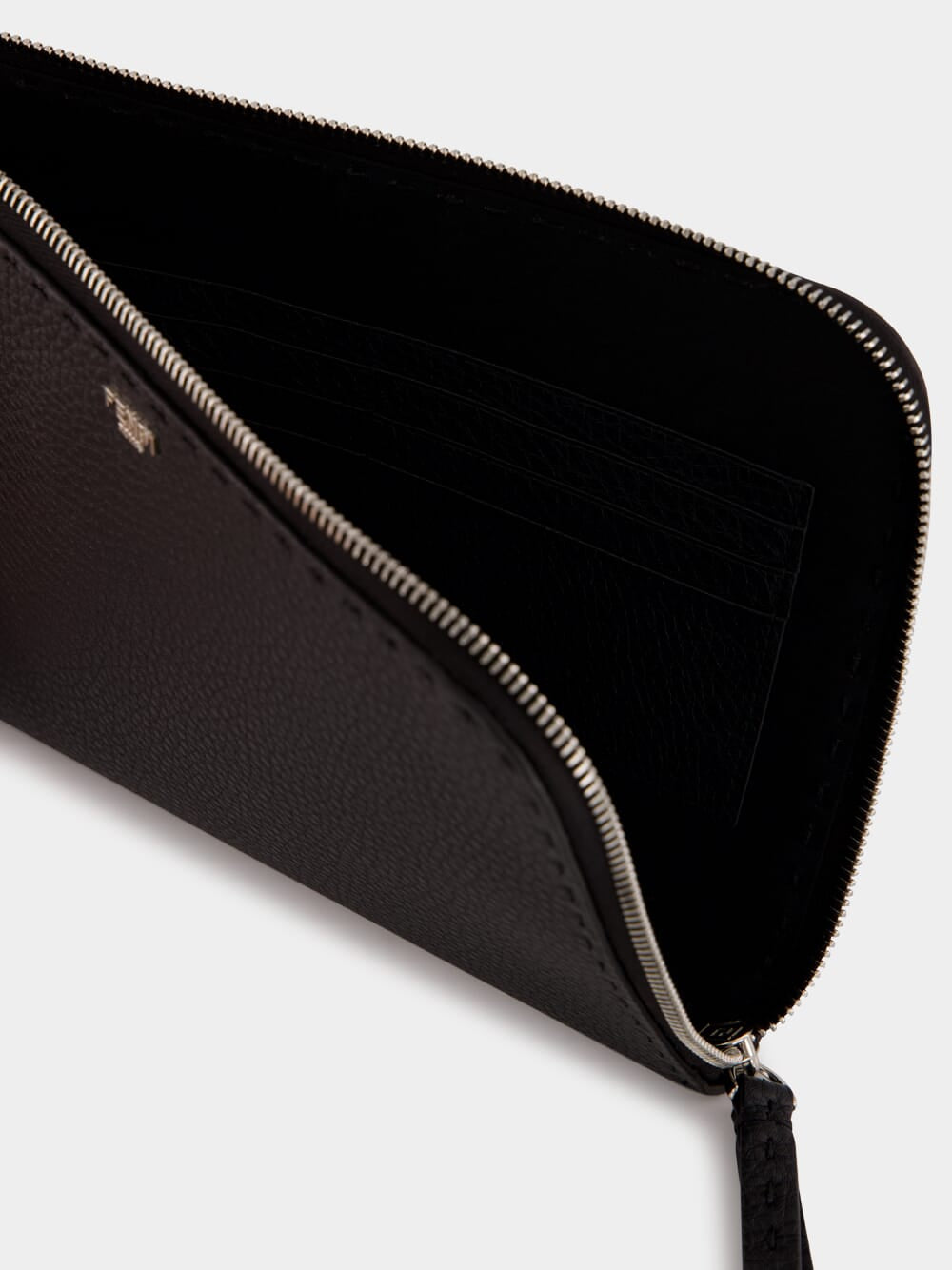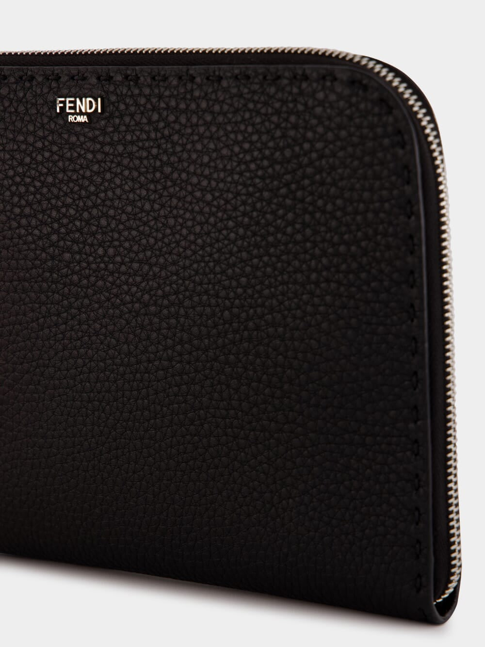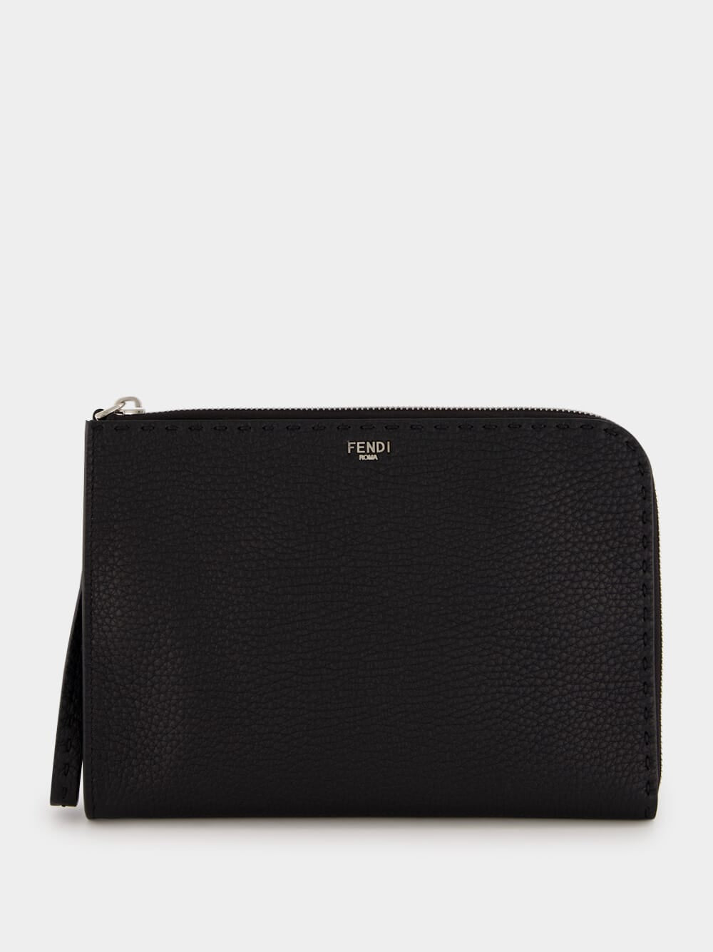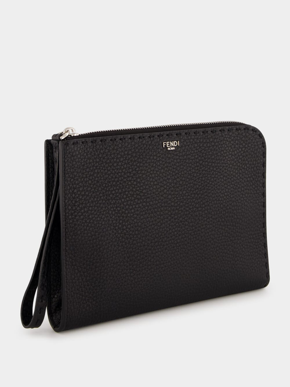 This Fendi Selleria small pouch embodies the brand's artisanal heritage, crafted from premium black Cuoio Romano leather with a refined texture. Showcasing 312 hand-sewn tone-on-tone topstitches, it reflects Fendi's iconic Selleria craftsmanship, passed down through generations since 1925. The pouch features a zip closure on two sides, a wrist strap for easy carrying, and an interior with six cardholder slots, offering functionality in a sleek, elegant design. Finished with palladium-finish metalware, this Italian-made piece is a sophisticated choice for the modern individual.